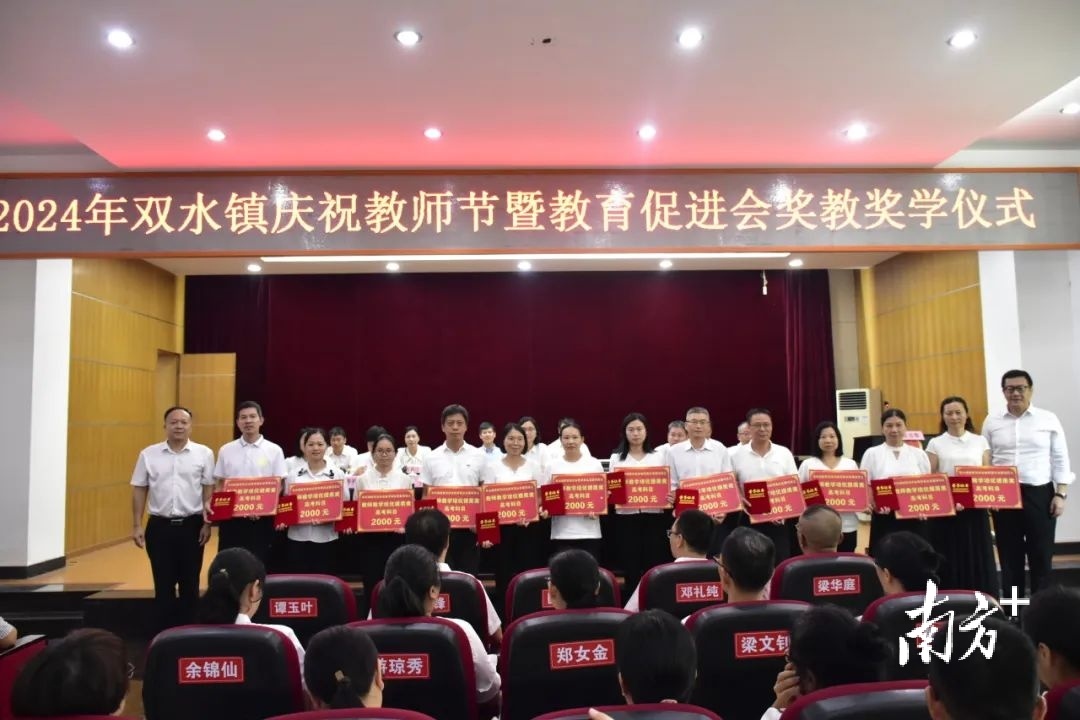 新会区双水镇举行的教师节庆祝活动上,镇教育促进会对先进教育工作者、优秀学子进行奖教奖学。双水镇教育促进会供图