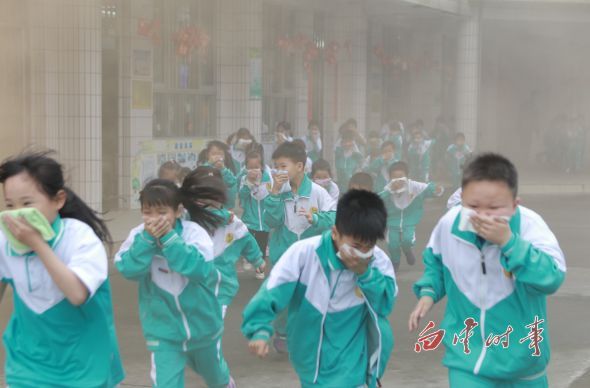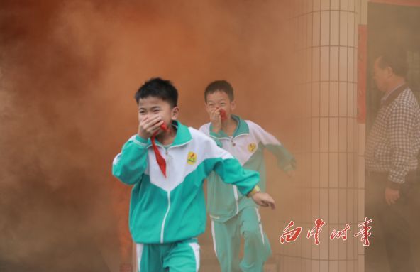 4月4日下午15时,良田第一小学发生“火灾”,听到火灾警报声响起,学生们迅速将毛巾弄湿捂住口鼻,并弯下腰按照逃生标识逃至操场。