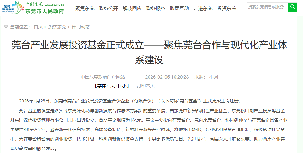 2026年2月6日,东莞市发展和改革局网站发布消息:东莞市莞台产业发展投资基金合伙企业(有限合伙)(以下简称“莞台基金”)正式完成工商注册。首期规模1亿元的基金扬帆起航。