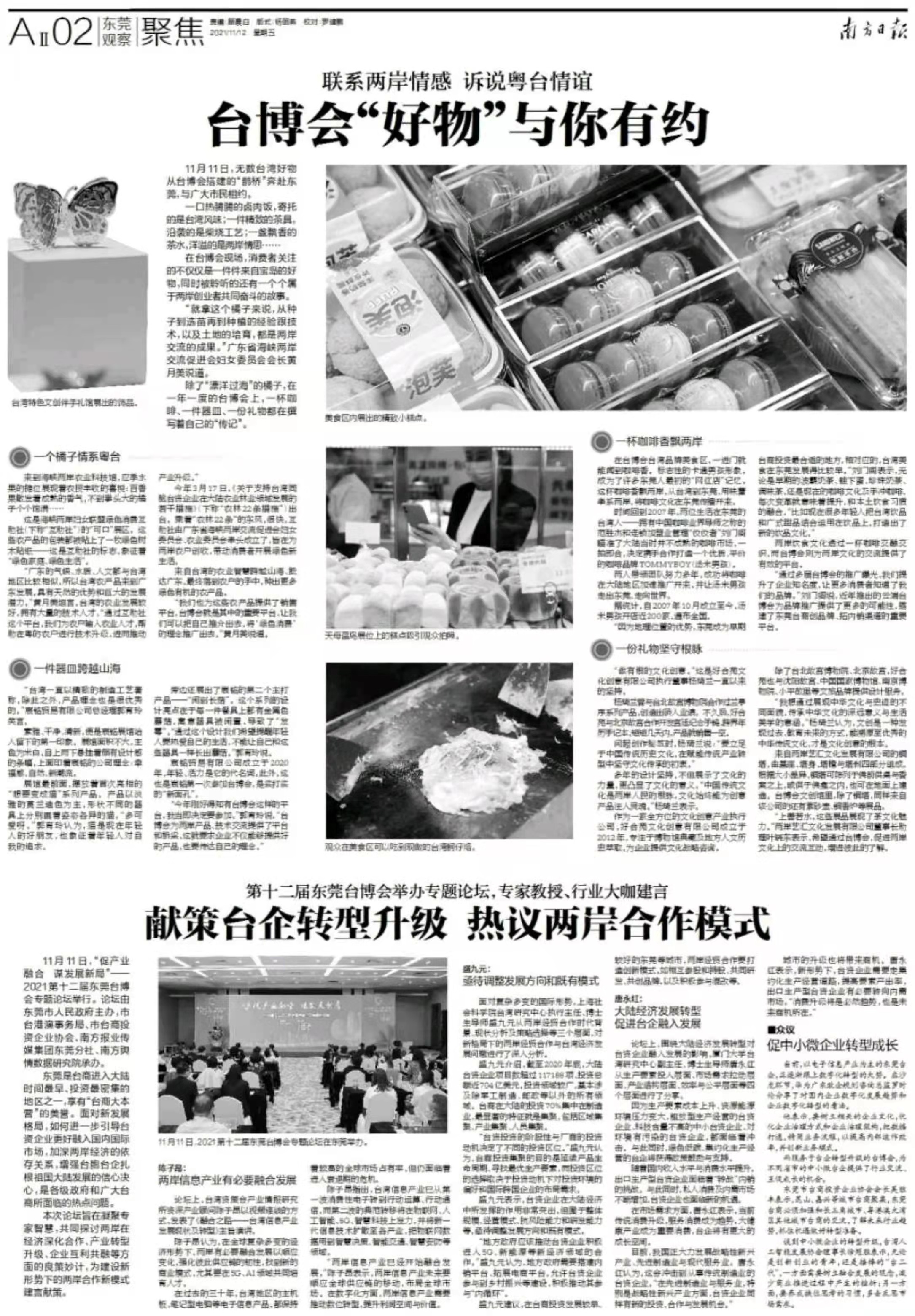 11月11日,“促产业融合 谋发展新局”——2021第十二届东莞台博会专题论坛举行。论坛由东莞市人民政府主办,市台港澳事务局、市台商投资企业协会、南方报业传媒集团东莞分社、南方舆情数据研究院承办。