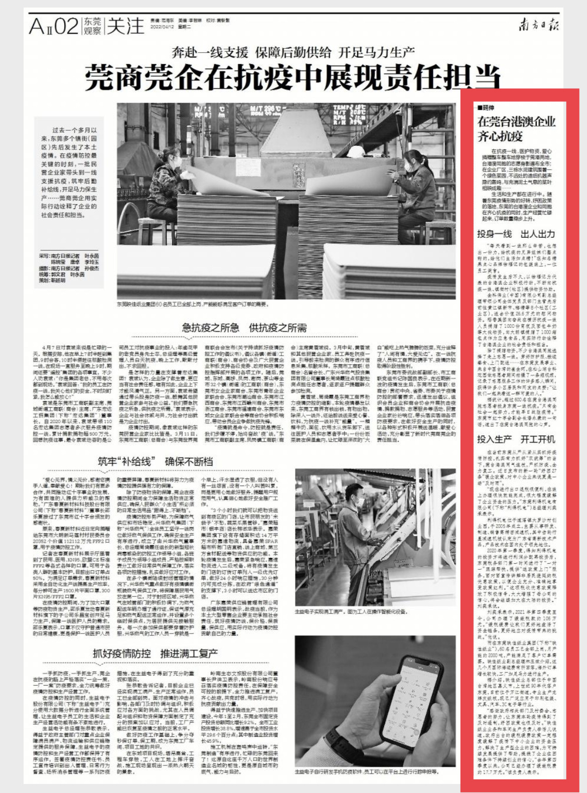 生活和生产都在进行中。随着东莞疫情形势的好转、纾困政策的落地,东莞的台港澳企业和同胞在齐心抗疫的同时,生产经营忙碌起来,订单数量稳步上升。