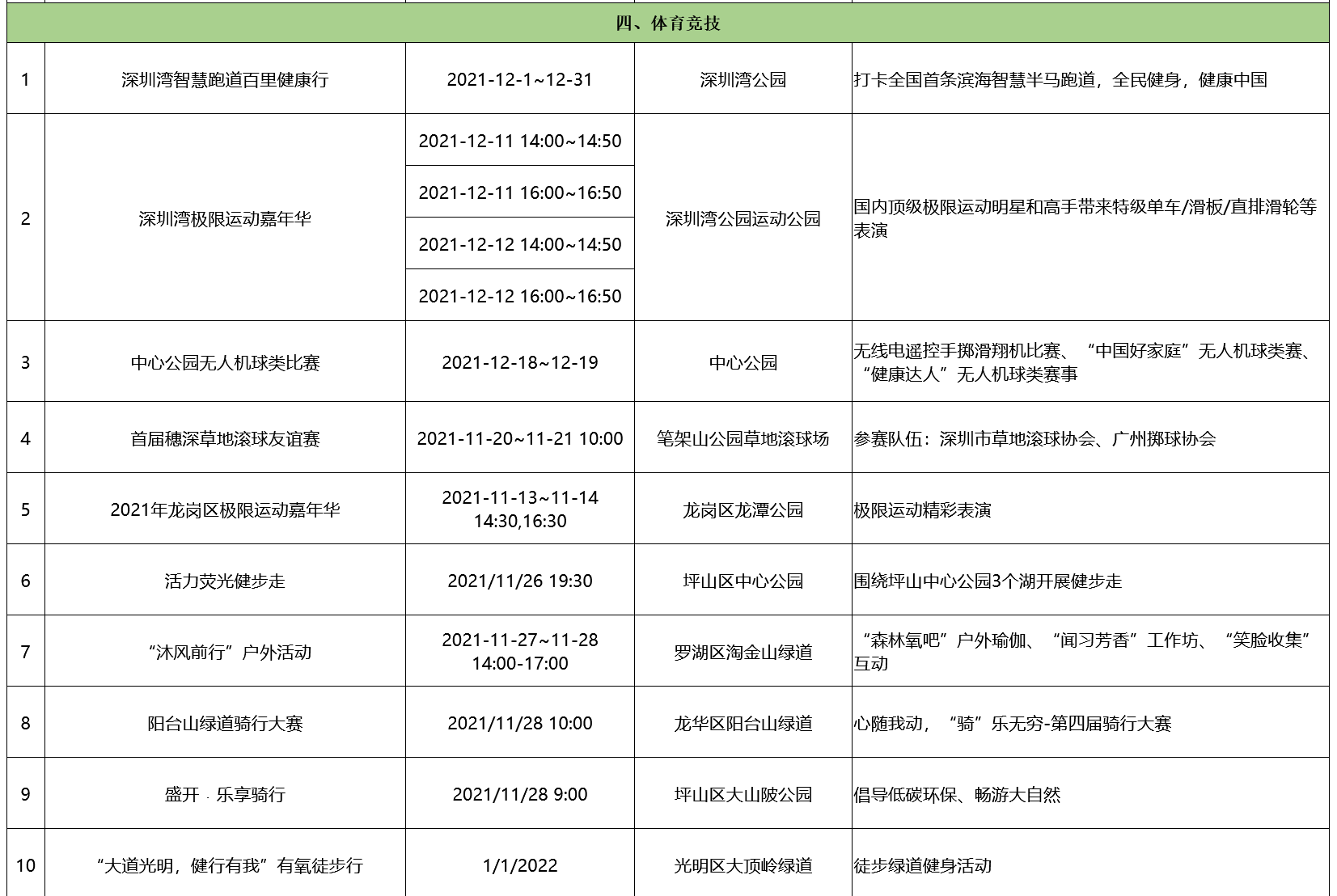 国际极限运动嘉年华活动已连续5年在深圳湾公园举办,被业内誉为国内最高水准极限运动表演。今年将以PK赛事的形式进行表演,带来更具紧张刺激的观感。深圳湾公园的智慧跑道百里健康行活动,龙华区的阳台山绿道骑行大赛、罗湖区淘金山绿道的“沐风前行”户外活动、坪山区中心公园的活力荧光健步走、光明区大顶岭绿道的“大道光明、健行有我”有氧徒步行等亲自然的体验活动,让市民在自然风光中收获健康生活。