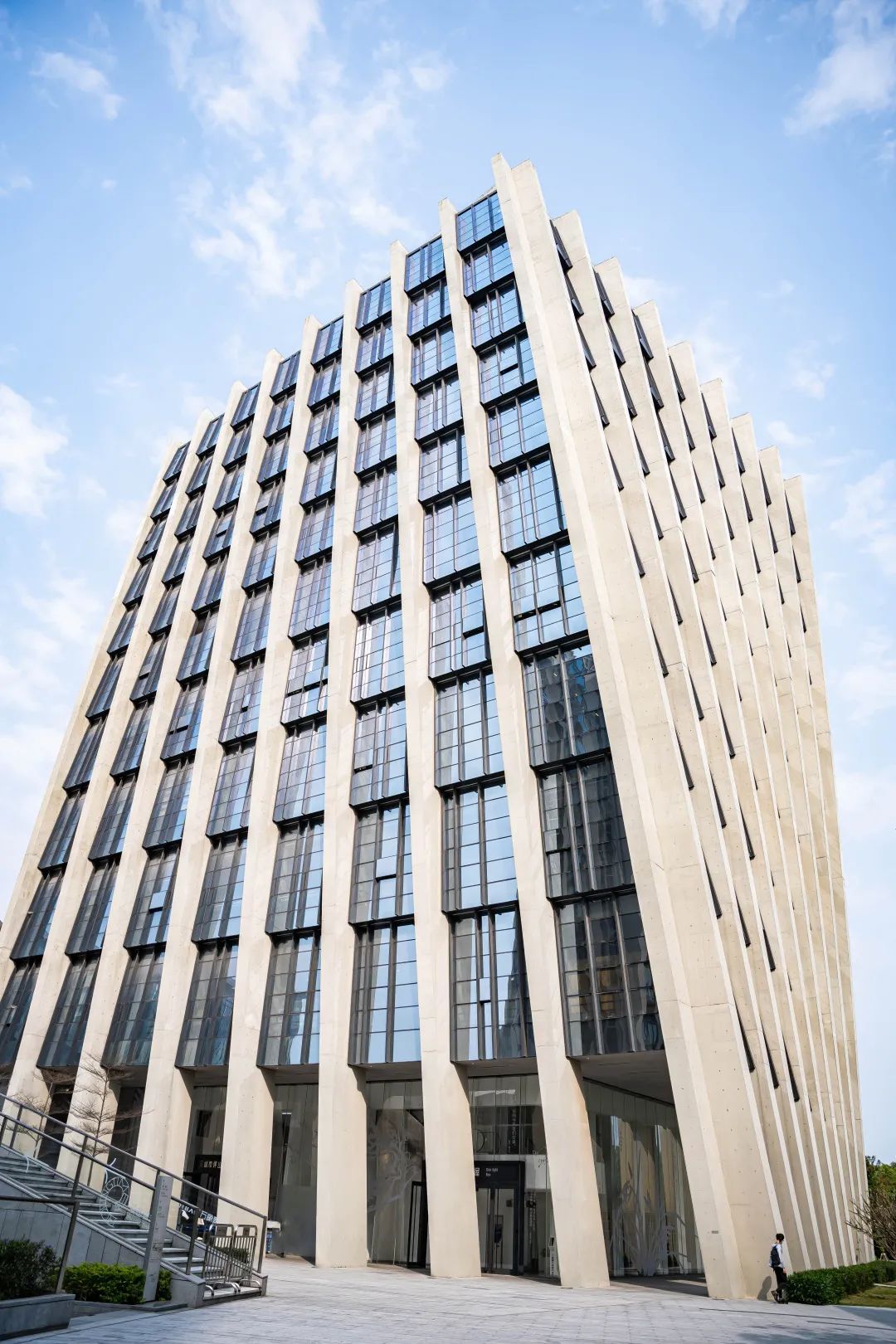 坪山图书馆在整个建筑群中最为独特,一共十层楼高,外观如折叠的书卷。