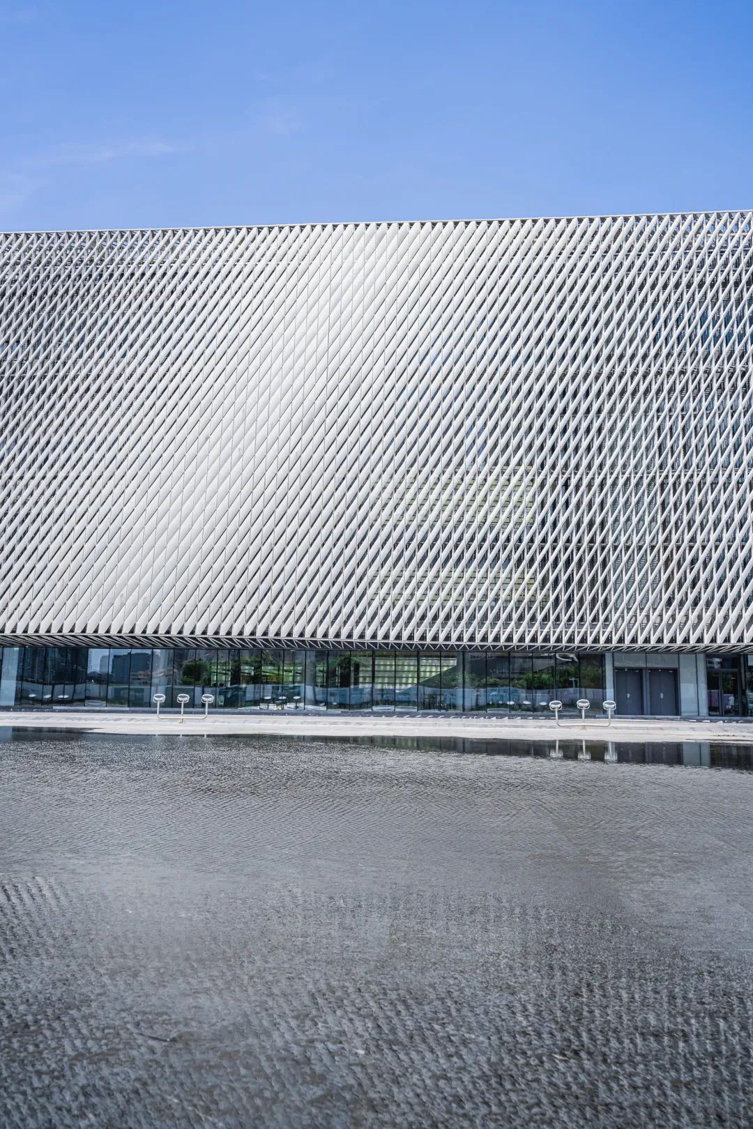宝安图书馆的波浪形外立面与馆前的湖水相呼应,也被称为“静置在水面上的图书馆”。