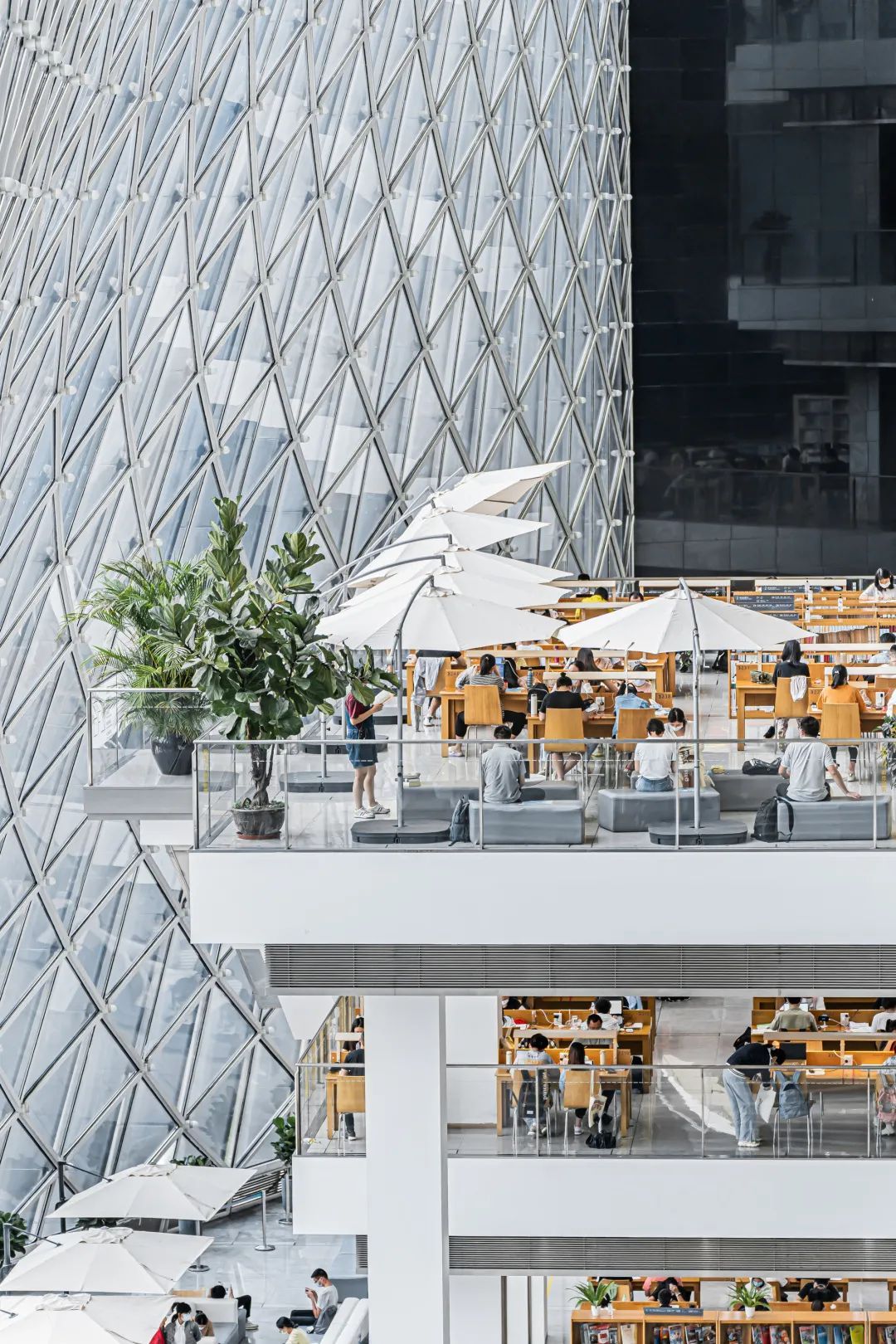 书城远观是八面体多边形结构,近看如翻开的书页。不同方位倾斜的金属外板,可根据太阳的不同角度调节温度摄入。