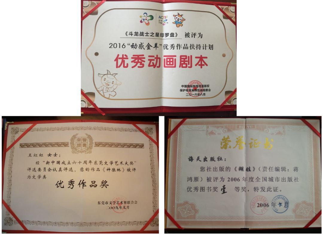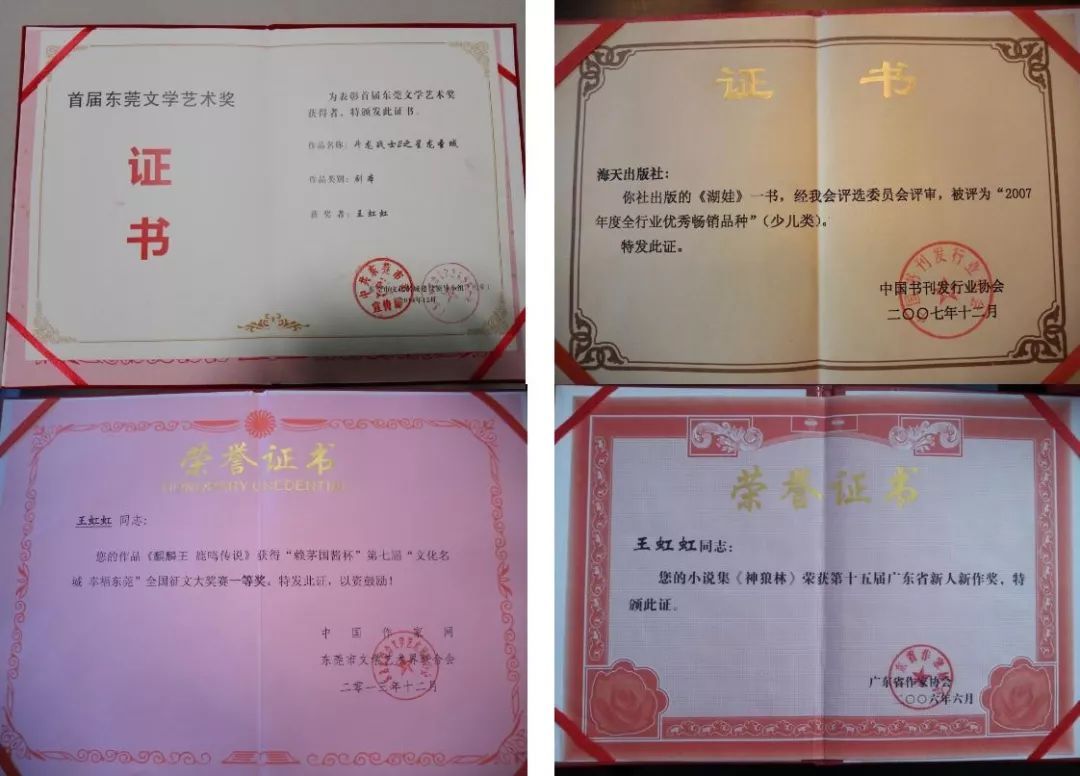 多年以来,王虹虹潜心创作,矢志不渝,取得了令人称道的创作成绩。早在初高中时期,王虹虹就创作出版了《神狼林》、《湖娃》等多部儿童文学作品,其中《神狼林》获第十五届广东省新人新作奖,《湖娃》获全国城市图书出版一等奖。此后,王虹虹在京、沪、穗等地多家报刊发表童话作品50余篇(部),发表作品达一百二十多万字,其童话作品受到广大青少年喜爱,获得全国性影响。2011年7月,被评为第十届广东东莞市"东莞十大杰出青年"。