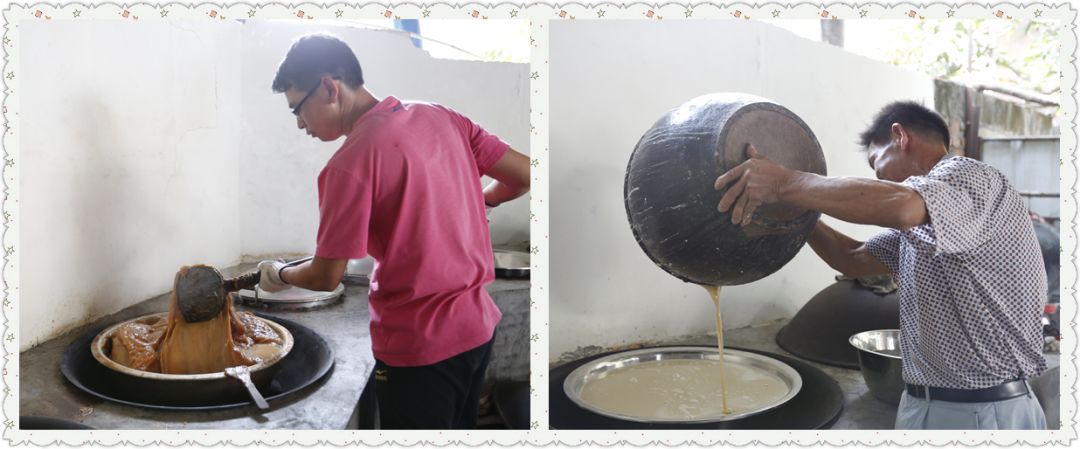 美味的圆笼粄,制作步骤耗时耗力。将糯米洗净、沥干,浸泡一夜;将米再次沥干后,打磨成粉;将糯米粉放入陶瓷缸内,加入滚烫的红糖水不停搅拌,期间还需要加入清水进行稀释,直到成为面糊形状;将搅拌好的半成品倒入大锅内,用柴火隔水猛蒸12个小时,在蒸的过程中,每隔半个小时就要掀盖搅拌一次,直到熟透。在蒸煮的空闲里,则采摘圆笼叶并洗净,焯水,将其垫放到不锈钢盆内,将蒸熟的圆笼粄分装进去后,再次猛火蒸透,带着圆笼叶香味的圆笼粄即可出锅。整个过程下来需要26个小时左右,尤其是在蒸煮过程中,需要不断添加柴火,开锅搅拌,繁琐且讲究的工序,需要全家总动员,经过大家努力,美味的圆笼粄才能大功告成。
