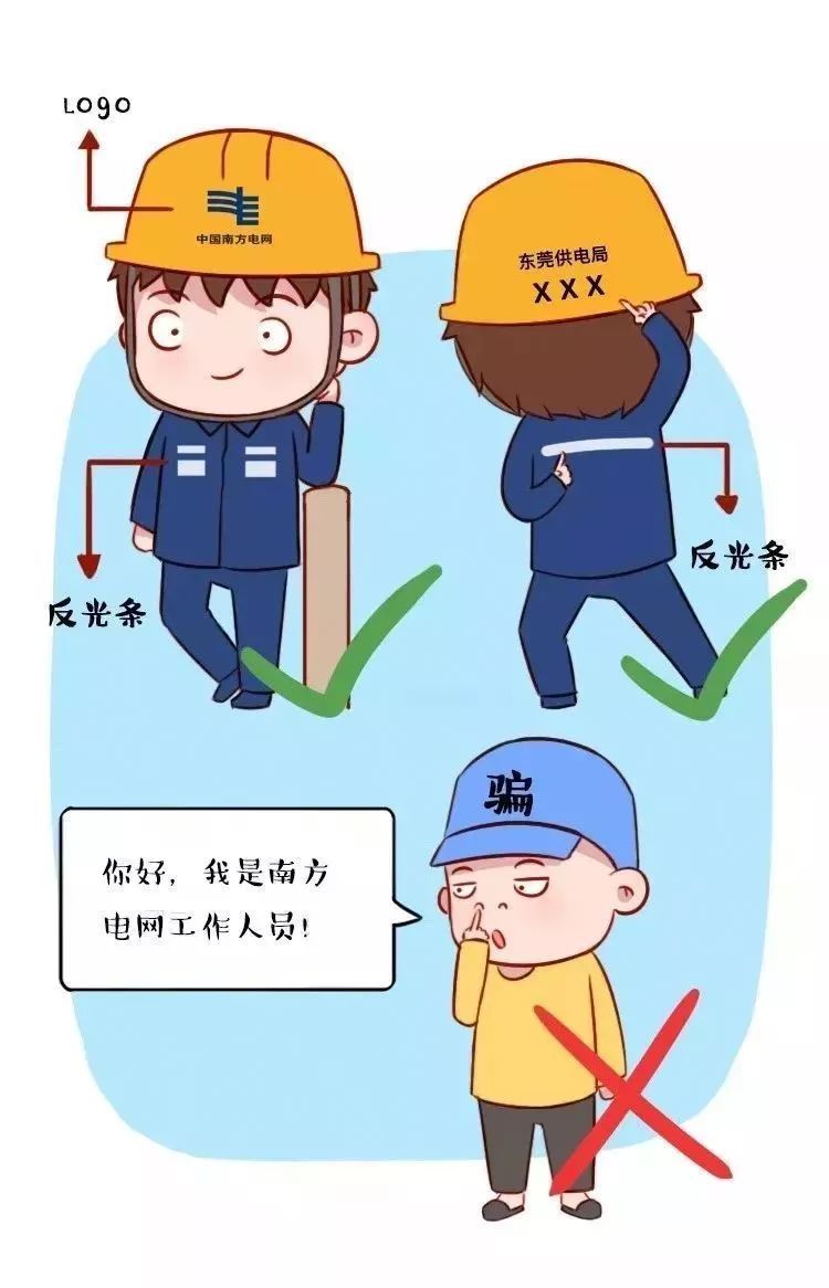 供电人员在工作时都会统一着装,佩戴安全帽,帽子上印有南方电网企业标志,在帽子背后有所属供电局的单位信息。