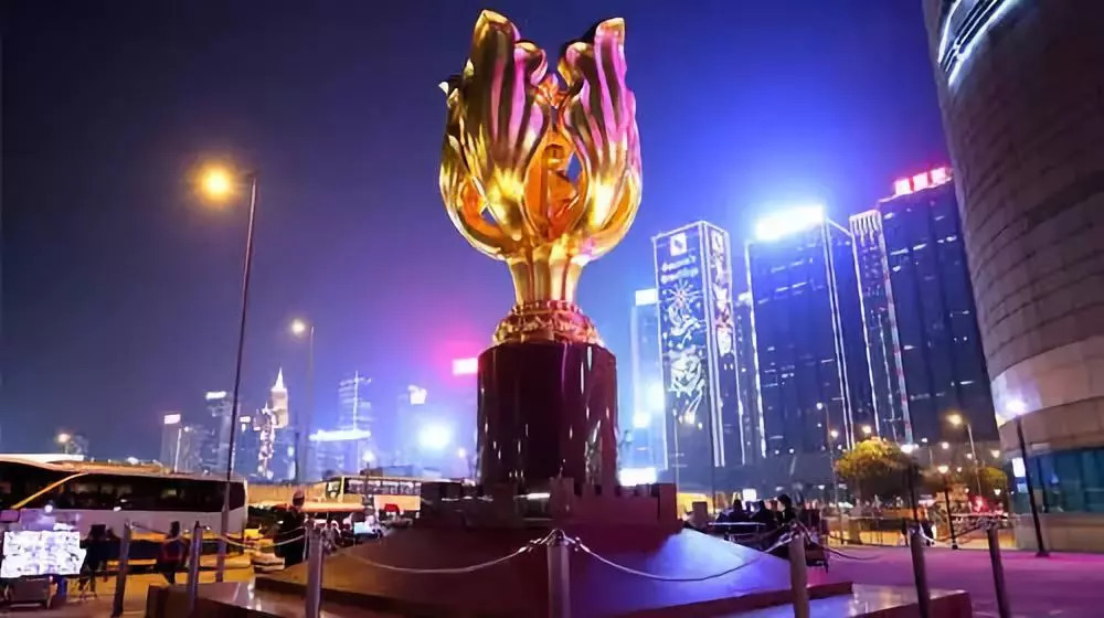 巨大的金色紫荆花铜像是香港回归的纪念性地标,在这里还可观看庄严的升降旗仪式。