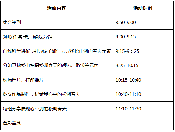 以摄影为载体,围绕寻找松山湖春天的主题去寻找积累写作素材,在自然科学讲解的过程中融入摄影语言的表达,提高孩子对自然科学观察探索的能力以及对色彩、构图等美学的把控,通过学习春天一系列的自然现象,寻找松山湖春天的颜色、形状等用小朋友的视角把文字与图片组合起来,表现松山湖的美丽春天。