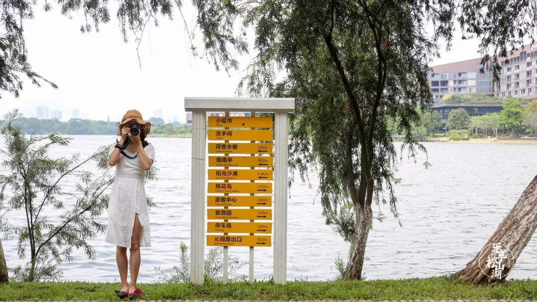 就连松湖烟雨的路牌,也学起了简约风,黄色和白色的搭配成为了绿化中靓丽的招牌。