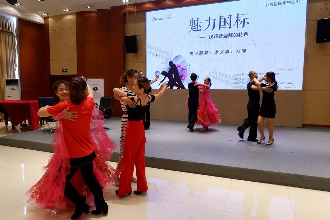 涂老师一一向观众介绍了摩登舞家族的华尔兹、探戈、维也纳华尔兹、狐步、快步以及拉丁舞家族的恰恰、桑巴、伦巴、斗牛、牛仔十类舞种的起源、发展及风格特点并让现场舞者当场进行展示。