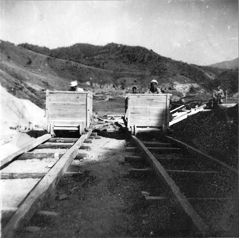 上世纪50年代,为了提高建设水库工作效率,工人们用轨车运土。(原图现藏源城区档案馆)