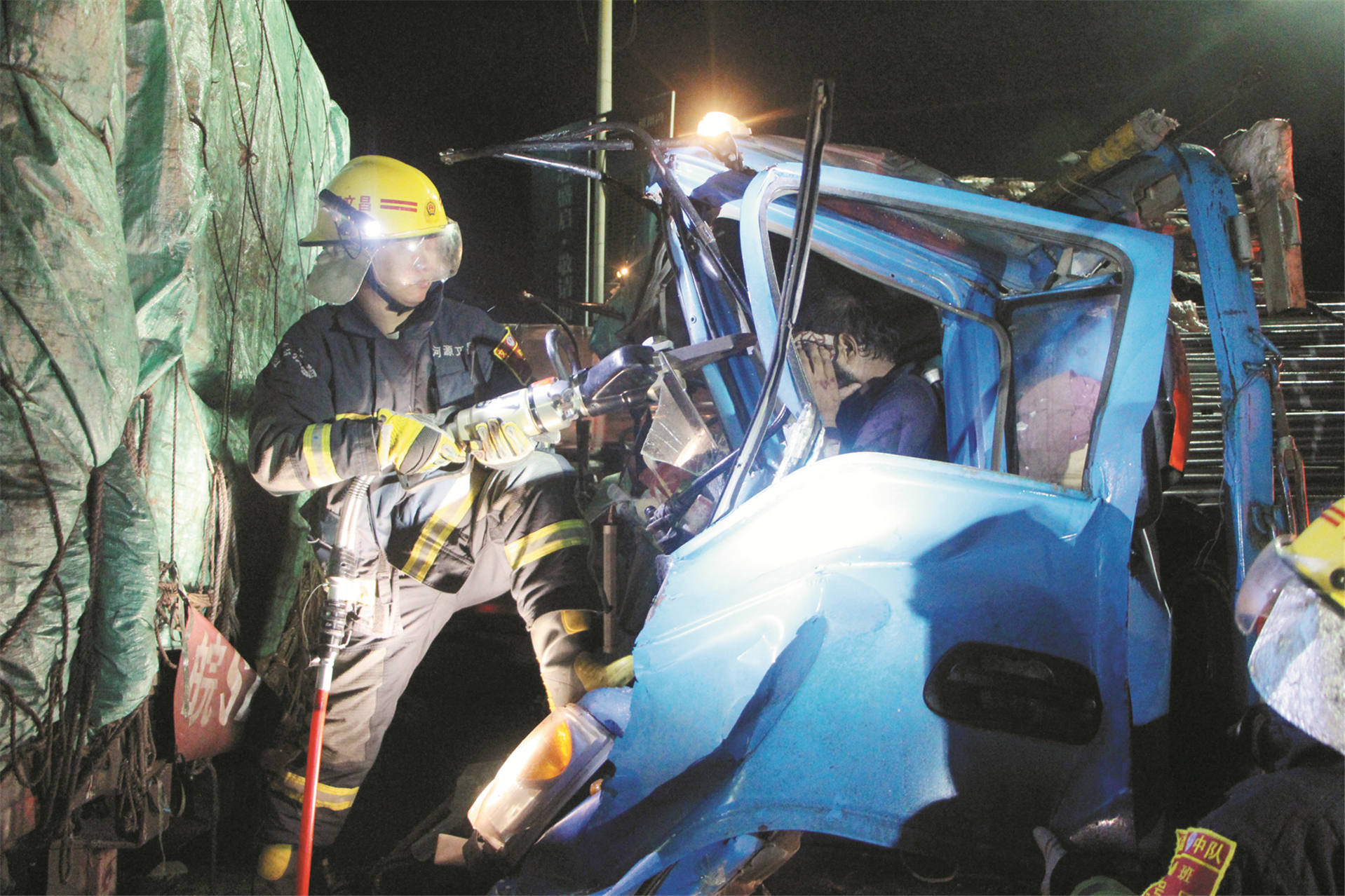昨日凌晨5时31分,源城区东环路与尖下村路口红绿灯交会处,两辆货车发生碰撞,有人被困。文昌消防中队接警后立即出动一辆消防车、6名官兵赶往事故现场。到达现场后,消防官兵经过近30分钟的奋力营救,将被困人员成功救出,现场移交给医务人员和交警部门处理。