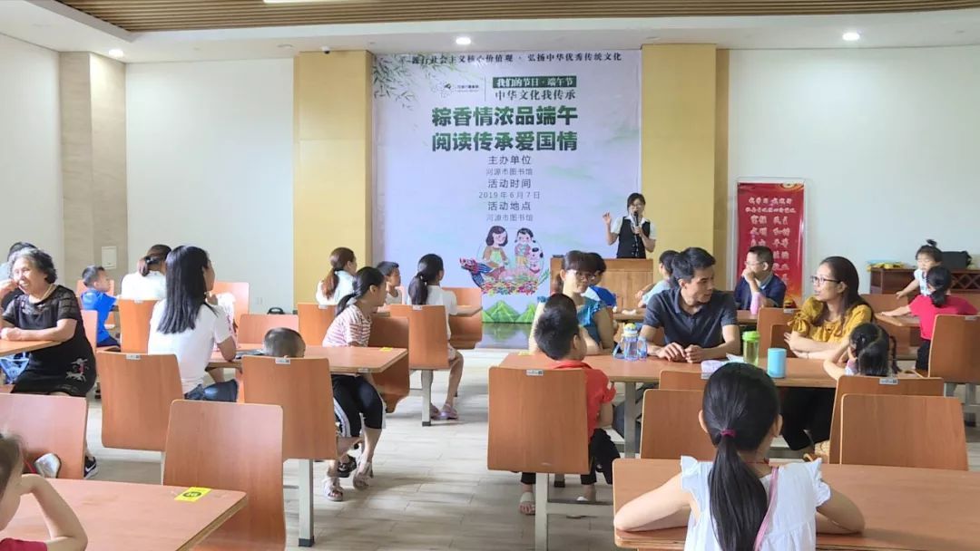 今天上午,河源市图书馆热闹举办了一场弘扬端午传统文化的活动,旨在践行社会主义核心价值观,呼吁社会公众尊重传统、继承传统、弘扬传统,增进青少年爱国主义思想情感。在活动现场,15个参与家庭欢乐相聚,一起聆听“屈原的爱国故事”,不少小朋友情绪高涨,踊跃到台上跟大家分享端午节的诗歌和故事。活动现场还教大家一起动手包粽子,感受端午乐趣。
