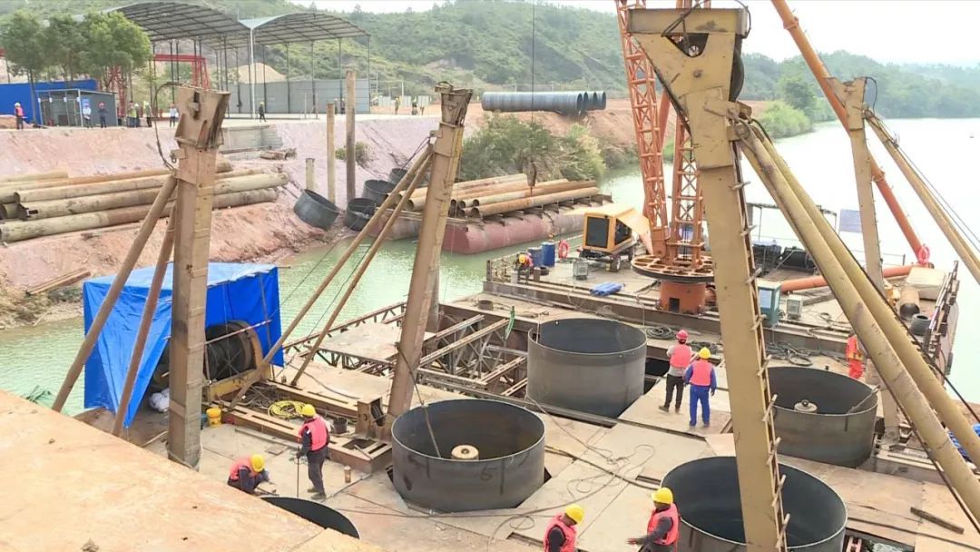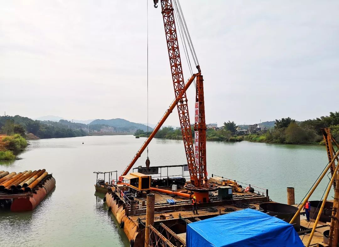 ▲在东江大桥施工现场,工作人员正在埋设钢护筒及对桥梁进行基础施工。