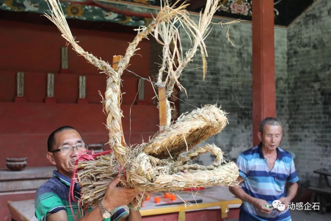草龙中间一般有一条绳,大概20米长;最关键的是龙头,龙头包括须、舌、眼、还有龙角;做得好看的,舞起来就生动些。稻草代表丰收,有丰收才有稻草,所以用稻草编织,就代表是丰收年。