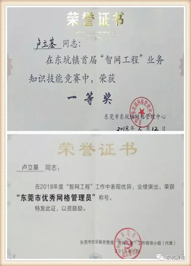 卢立基对工作兢兢业业,不怕苦不怕累,耐心做群众的解释工作,最终获得了群众的信任。回想做网格员的历程,卢立基说,网格员既充当群众诉求的信息员、又是矛盾纠纷的调解员、同时还是安全防范的宣传员,能及时把问题解决在萌芽状态,真正做到网格内的小事不出“格”就能解决。2018年卢立基在我镇举行的首届“智网工程”业务知识技能竞赛中荣获一等奖,代表东坑镇网格员参加市业务知识竞赛并进入复赛;同时,荣获2018年度“东莞市优秀网格管理员”称号。