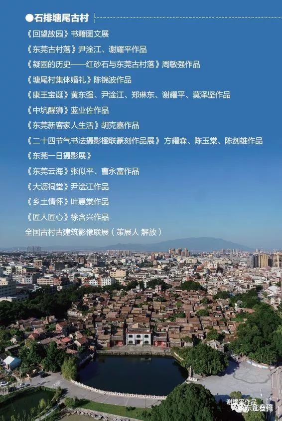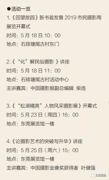 今年的市民摄影周将持续到5月26日,期间将在石排镇塘尾古村、东莞展览馆、东莞图书馆、东莞规划展览馆推出40个摄影展览。其中,塘尾古村作为《回望故园》精彩作品拍摄地以及本次市民摄影周的主要展场,将重点推出《回望故园——东莞村落记忆》书籍图文展、“全国古村古建筑影像联展”。