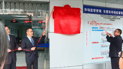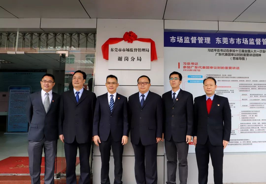 2月25日上午,谢岗镇委书记胡毅峰、东莞市市场监督管理局副调研员李峙、科长张吉、谢岗镇副镇长林锦彪、杨景新等为东莞市市场监督管理局谢岗分局揭牌。