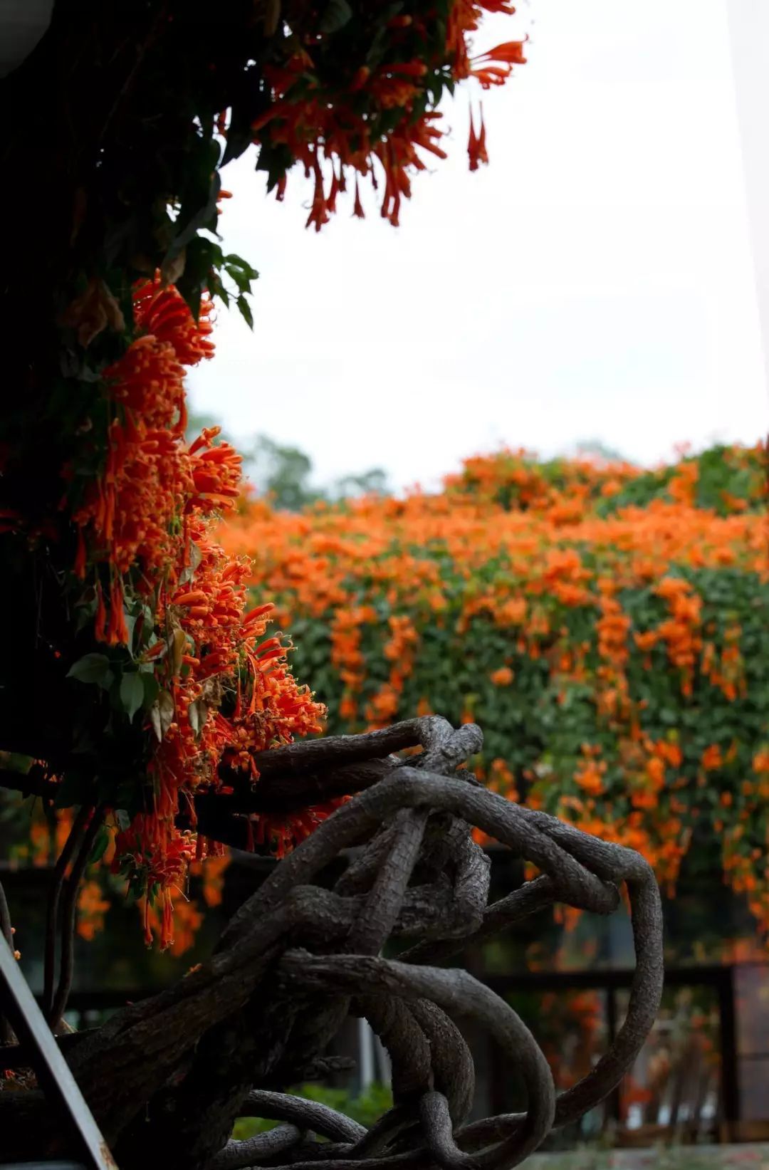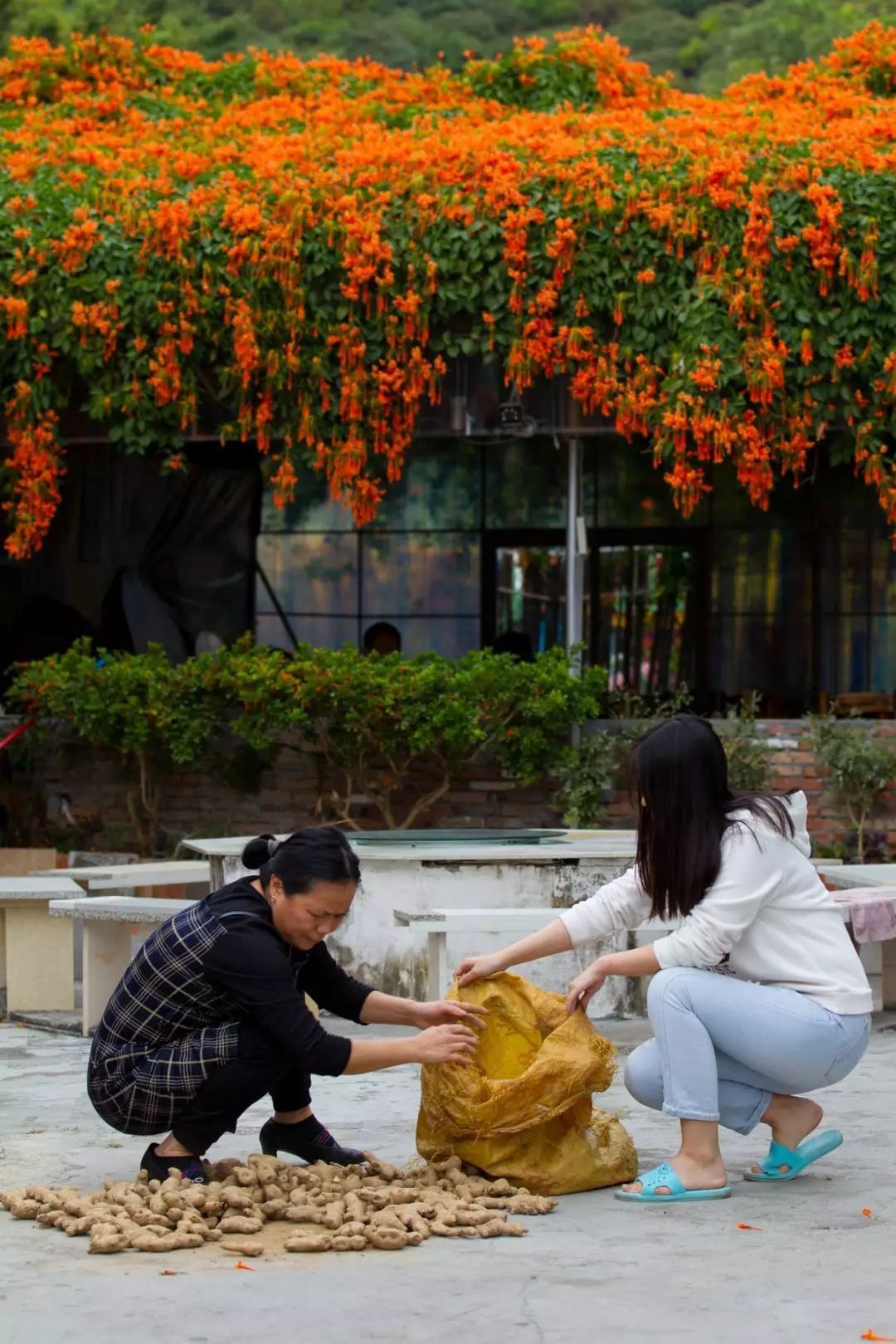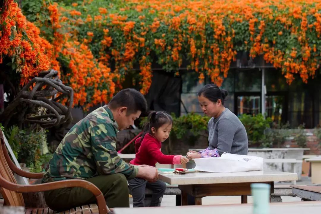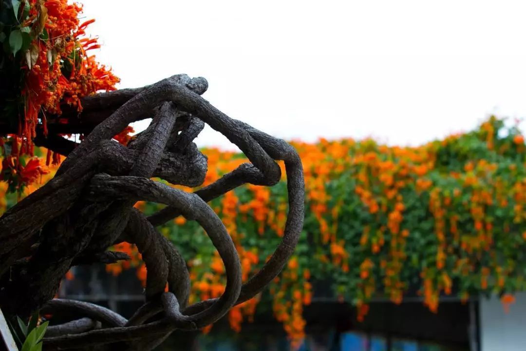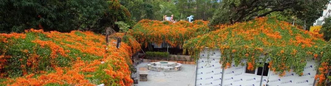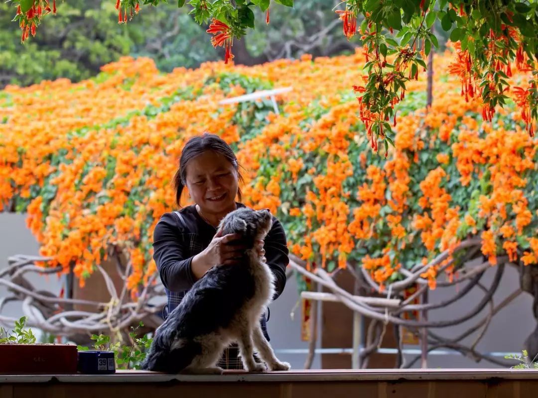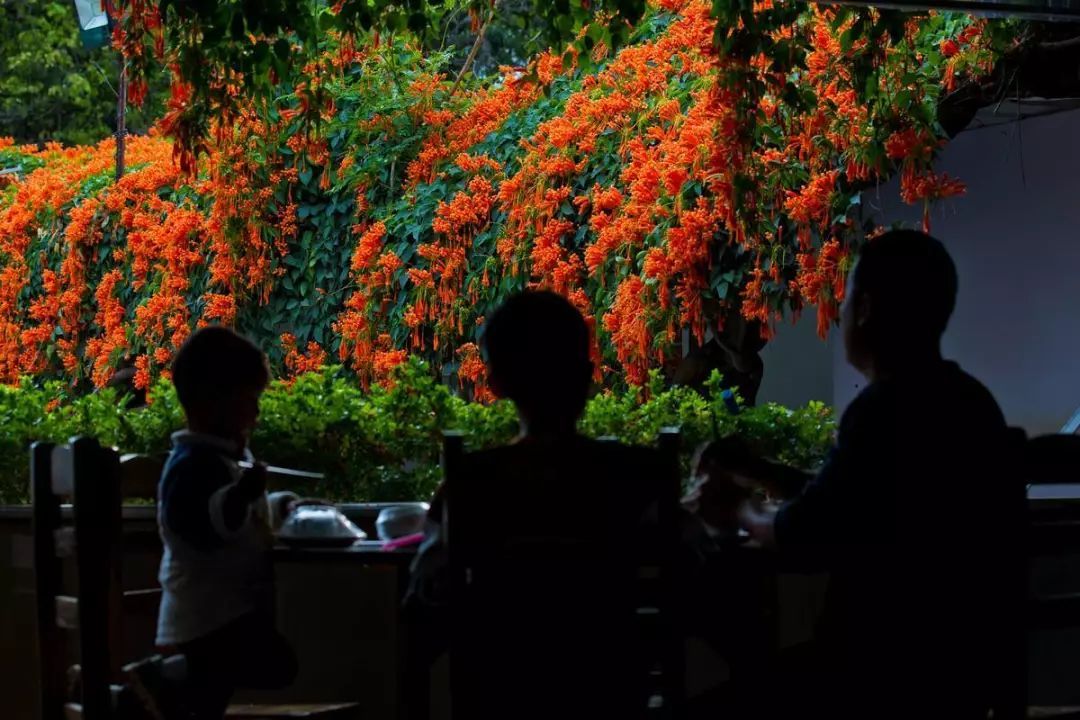 院里这些炮仗花是吴大哥2003年冬天栽种的,种下去的时候仅只手指这么大小,16年后的今天,每株直径都有20厘米粗壮。当初种它,只是想用来遮阴纳凉,没料到年年繁盛似火、满园生辉。