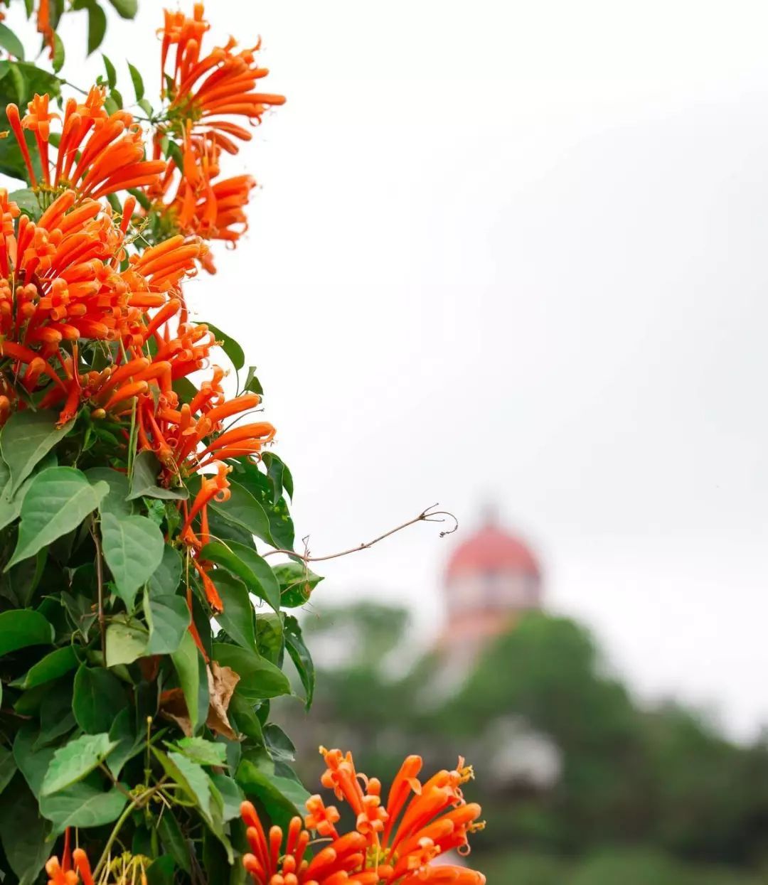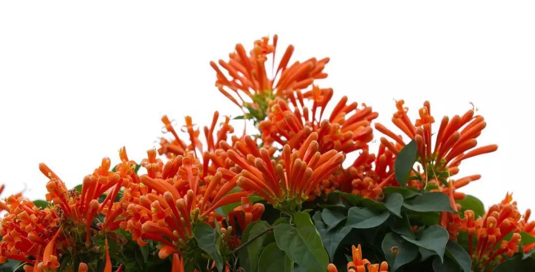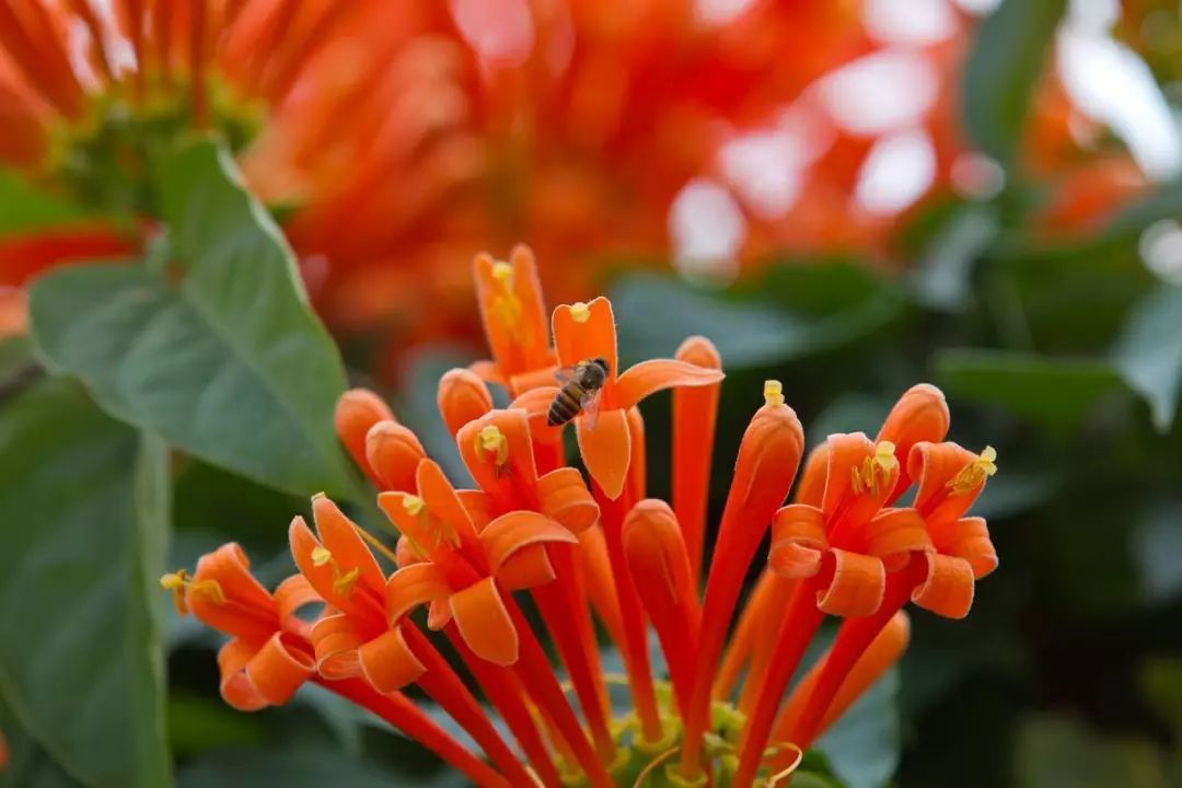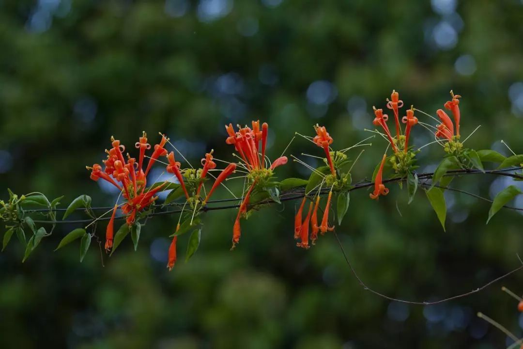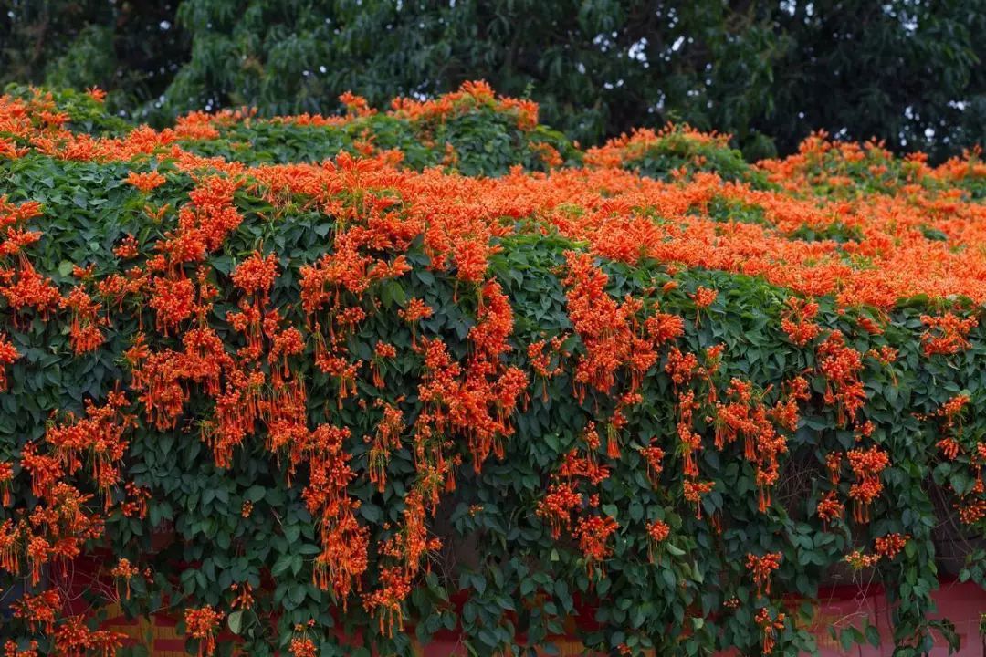 只见炮仗花藤繁叶茂、花团锦簇、鲜艳夺目。细看,花列成串,累累下垂,花蕾似锦囊,花冠若罄钟,花丝如点绛,满棚满架,橙红鲜艳,连串着生,垂挂树头。橘红色的花,密集成穗,成串摇曳于枝头,颇像一挂挂即将点燃的鞭炮,让人倍感喜庆。