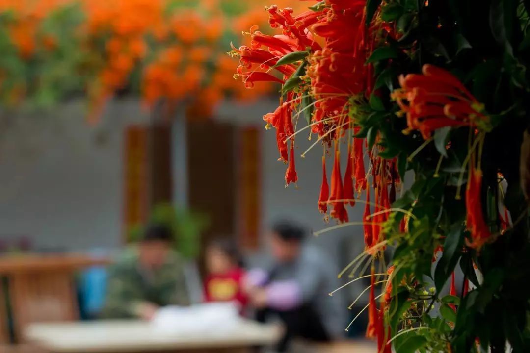 从门外看,这一片金灿灿的炮仗花,正沿着庭院的四周顺势蔓延疯长,如水波般起伏错落。走进庭院里面,人立即就被密密麻麻的橘红色的“焰火”包围着,仿如置身花海的别样感觉。