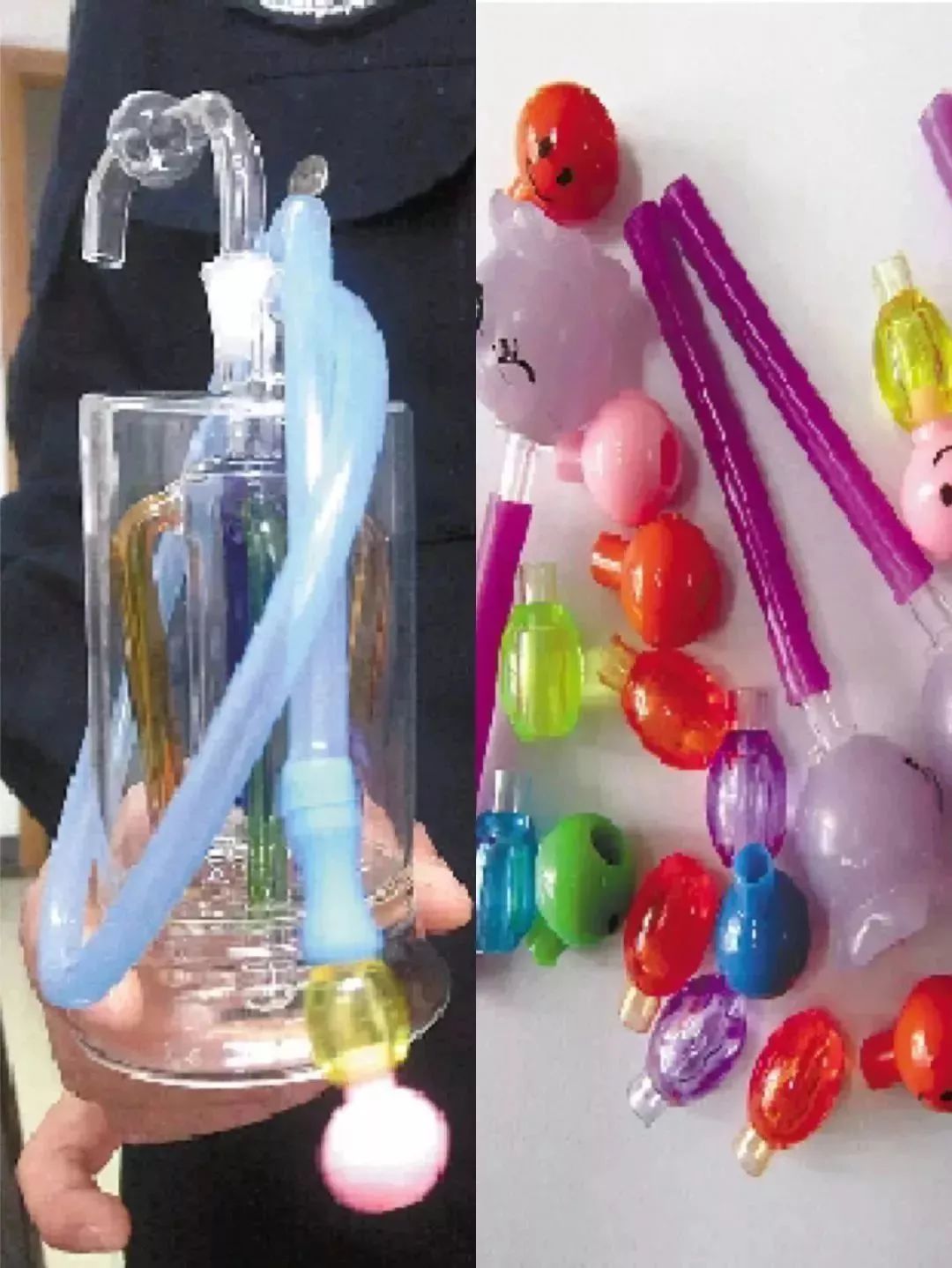 吸毒者只要将章鱼头顶连接上吸管,再将吸管插到瓶子上,一个彩色的冰壶就组装完成了。对准章鱼嘴,就能吸食。
