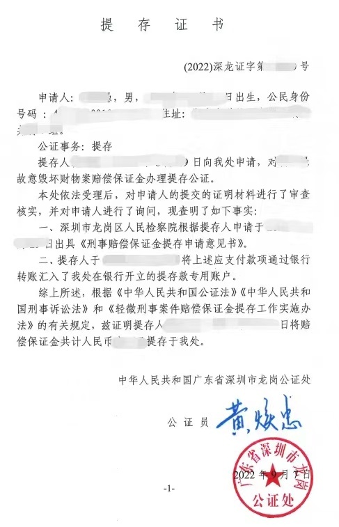 据了解,一犯罪嫌疑人因涉嫌故意毁坏财物被刑事羁押,其自愿承担赔偿责任,但暂未与被害方达成赔偿协议。为切实保障当事双方的合法权益,龙岗公证处与龙岗区人民检察院启动赔偿保证金提存协同合作机制,就该案及时出具公证文书,完成赔偿保证金提存工作。这是龙岗区推行“轻微刑事案件适用赔偿保证金提存制度”后办理的首宗案件,也为深圳首例。