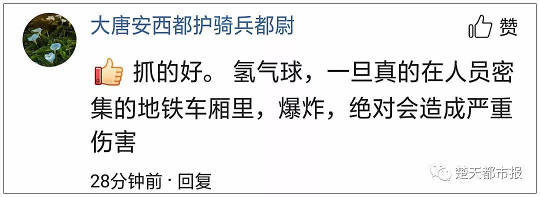 近日,武汉地铁站有一名男子竟在站厅内点燃氢气球还将气球抛到空中……