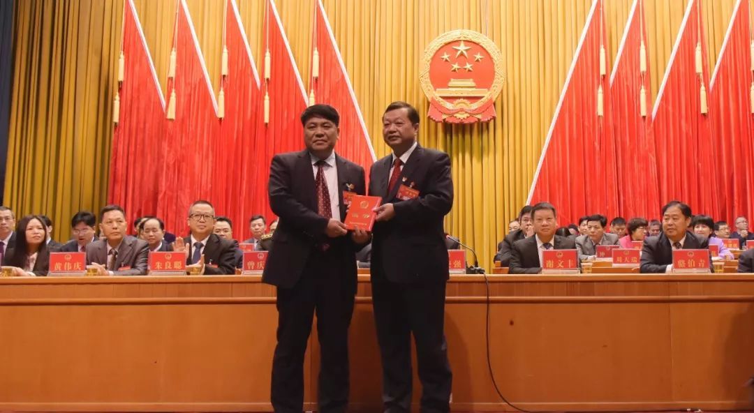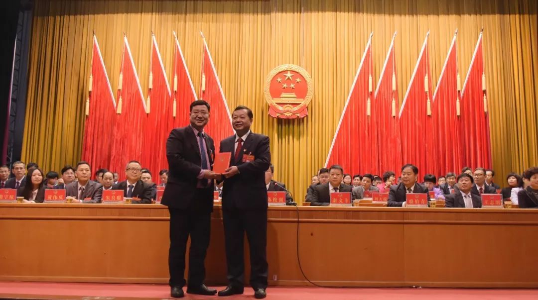 ▲会上,县人大常委会主任刘天瑞代表大会主席团为新当选的县人大常委会副主任、县人大常委会部分委员和表决通过的县十六届人大社会建设委员会组成人员颁发当选证书。