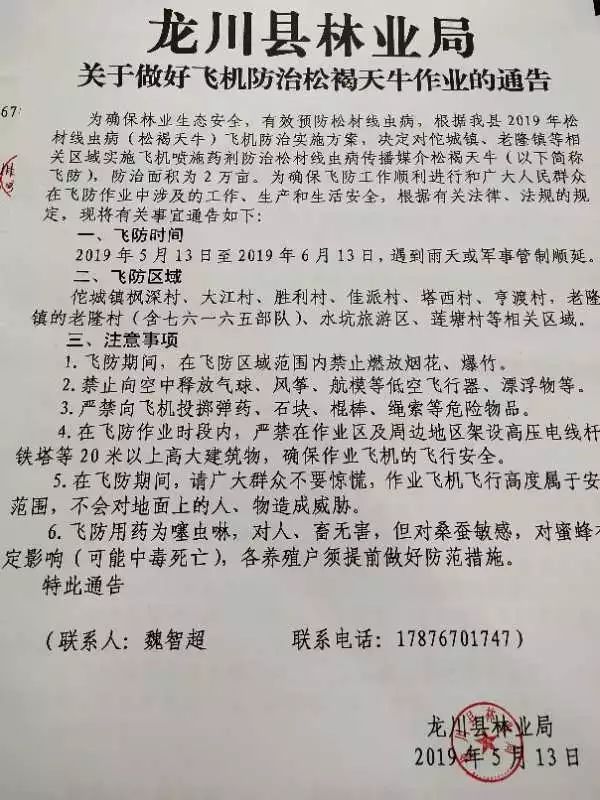 为确保林业生态安全,有效预防松材线虫病,根据我县 2019 年松材线虫病(松褐天牛)飞机防治实施方案,决定对佗城镇、老隆镇等相关区域实施飞机喷施药剂防治松材线虫病传播媒介松褐天牛(以下简称 飞防),防治面积为 2 万亩。为确保飞防工作顺利进行和广大人民群众在飞防作业中涉及的工作、生产和生活安全,根据有关法律、法规的规定,现将有关事宜通告如下: