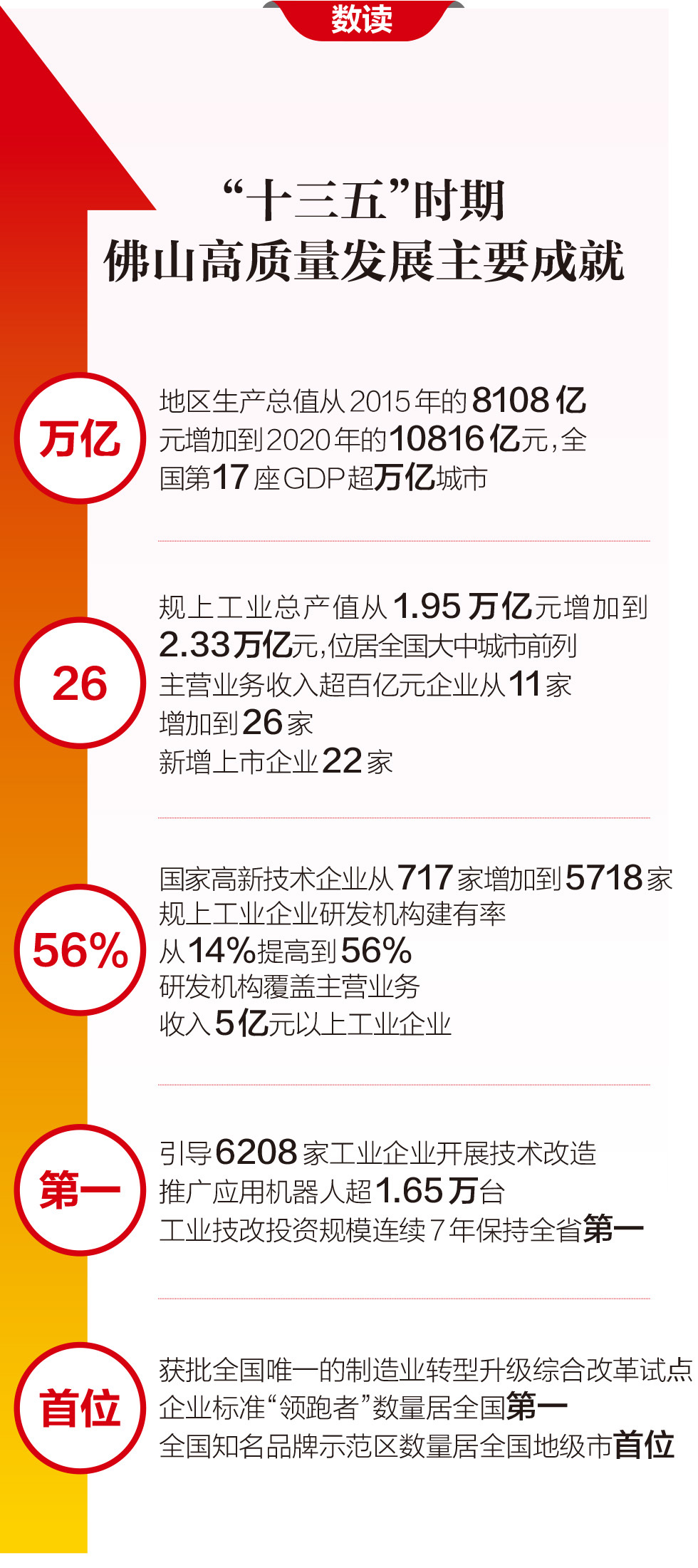 “佛山靠制造业立市、富民,这是历史,也是现实,更是发展规律。必须把制造业推向中高端作为强市之基,推动制造业质量变革、效率变革、动力变革,争当地级市高质量发展领头羊。”佛山市委书记郑轲说。