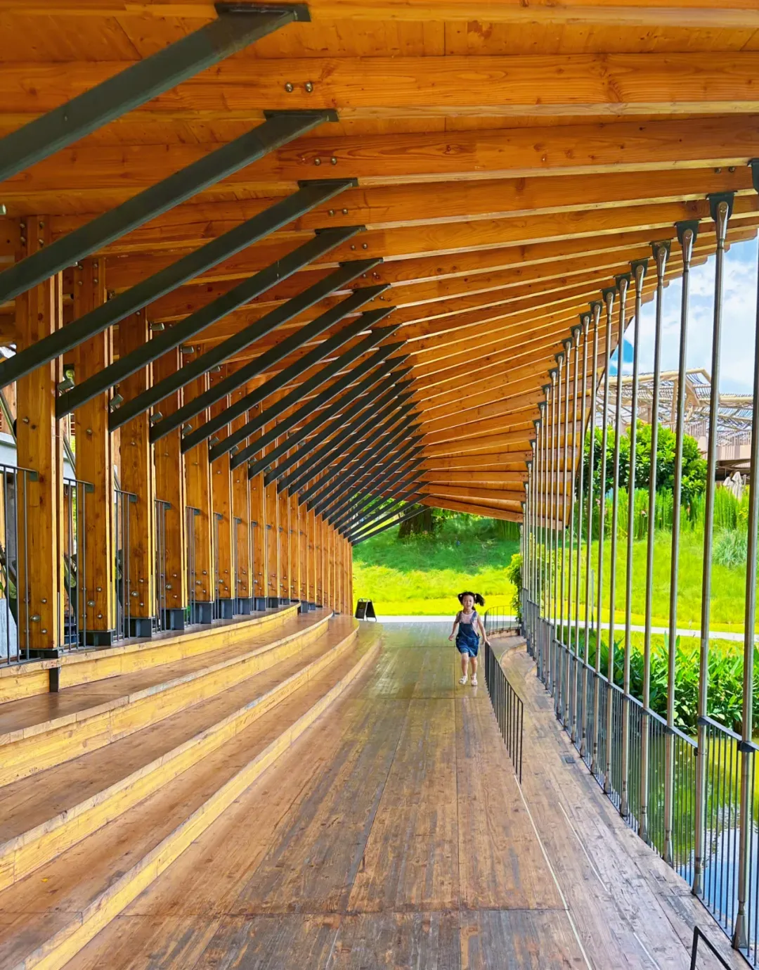 在桥廊的两端为了稳定结构在中段设置了横向连接杆件,并搭放了两个观景平台,营造层次更丰富的视觉效果。