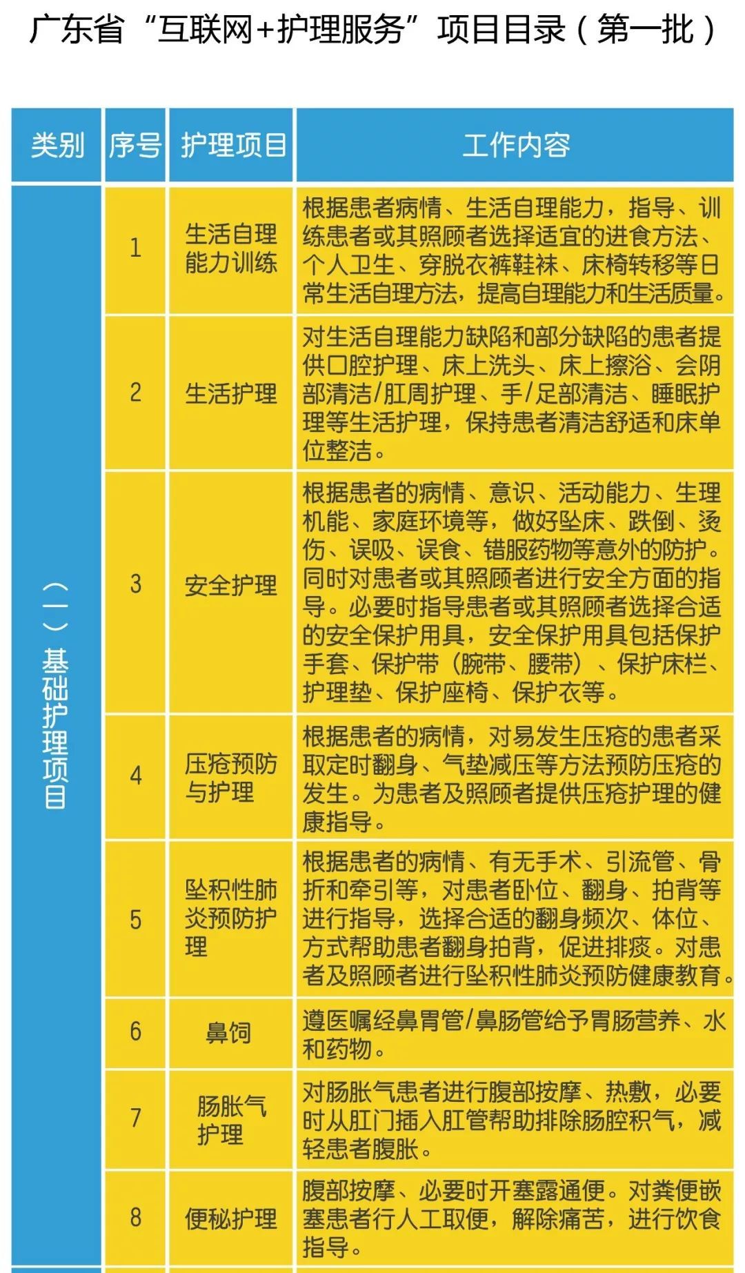 在“网约护士”可提供的服务项目方面,各试点医疗机构依据广东省卫生健康委员会确定的第一批43项“互联网+护理服务”项目服务内容,结合自身服务能力,从中遴选本机构可提供的服务项目实施。据悉,43项服务项目涵盖基础护理、慢病管理、康复护理、老年护理、中医护理、母婴护理、产后访视、骨科护理、健康教育、安宁疗护等服务内容。