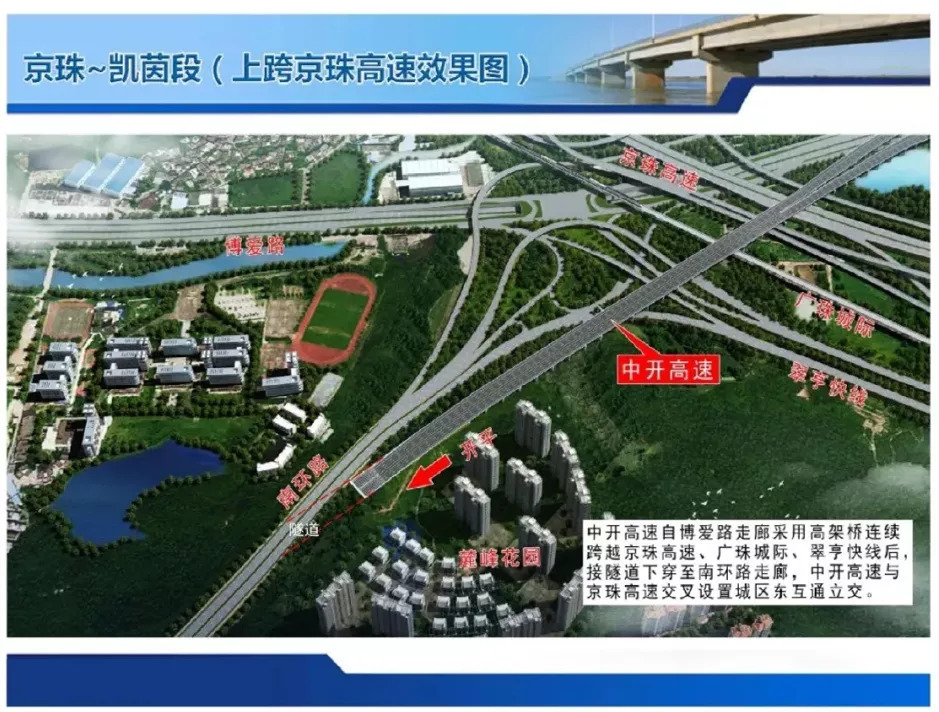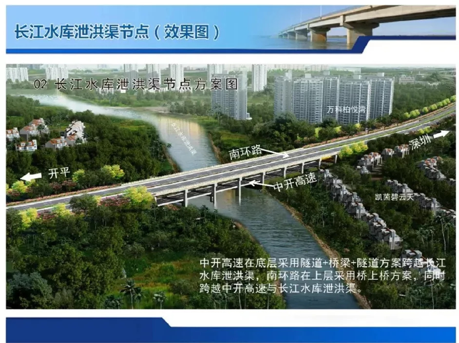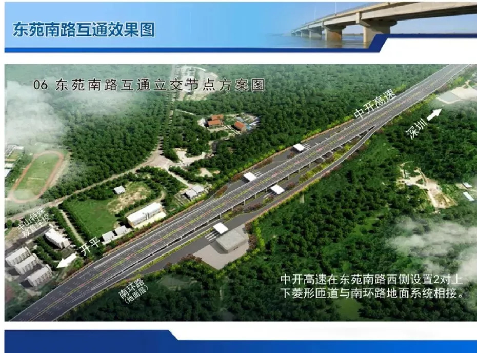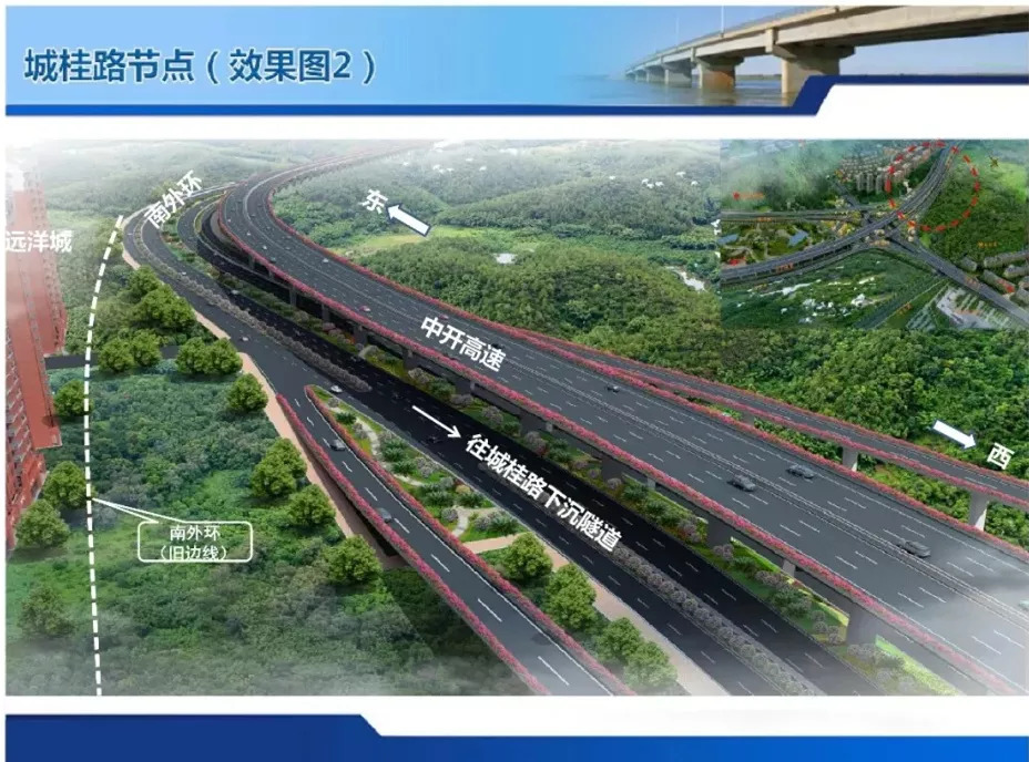 其中,景观路以西至南外环城桂路立交节点段,结合坦洲快线建设全互通立交的要求,中开高速(含部分南外环路段)向南偏移。南移后,南外环城桂路立交节点向南移了100多米。