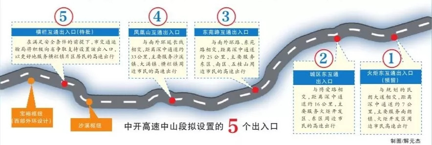 据中山市交通运输局相关负责人介绍,中开高速中山段拟设置5个出入口,包括火炬东互通(预留出入口)、城区东互通、东苑路互通、凤凰山互通、横栏互通(待批)。