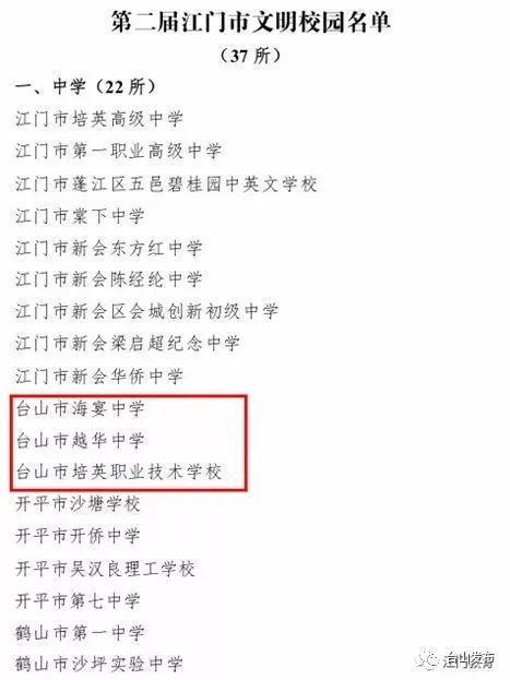 近日,江门市精神文明建设委员会公布第二届江门市文明校园名单,我市海宴中学、越华中学、培英职业技术学校、台城城东小学、培正小学和台城中心小学等六所中小学校上榜。