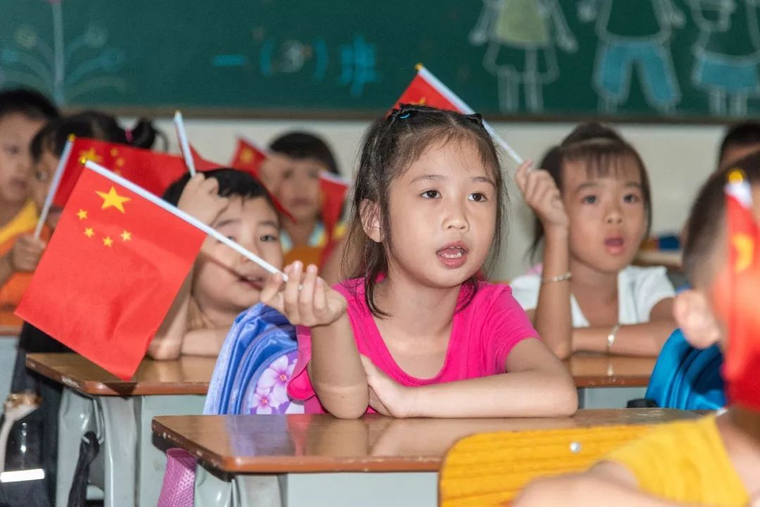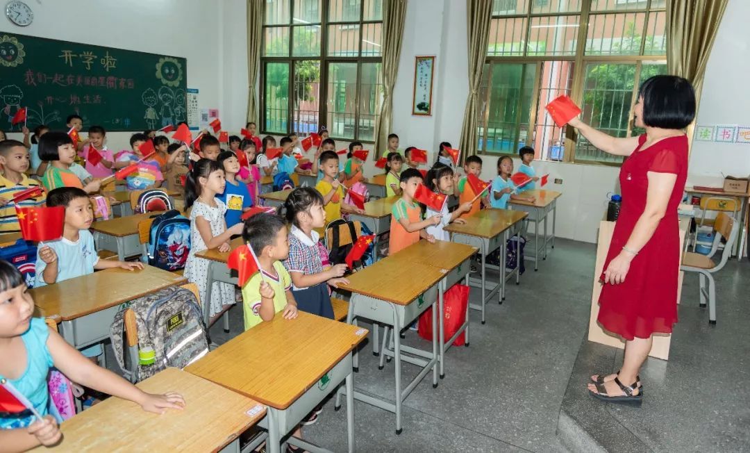 一年级(3)班举行了《开学第一课》主题班会。在这个班会上,老师发给同学们每人一面国旗,他们一起歌唱“五星红旗我为你骄傲......”,一起诵读“新新的课本、新新的同学”。