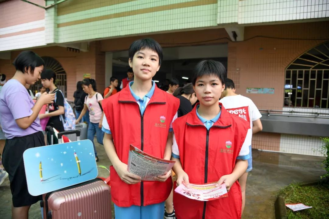 初二年级的学长学姐成了志愿者,穿着红马甲主动帮助学弟学妹和家长指路、介绍流程、带去宿舍、介绍学校环境设施等等。他们表示当年自己也是这样被学长学姐接待的,现在自己能够接待学弟学妹非常开心。