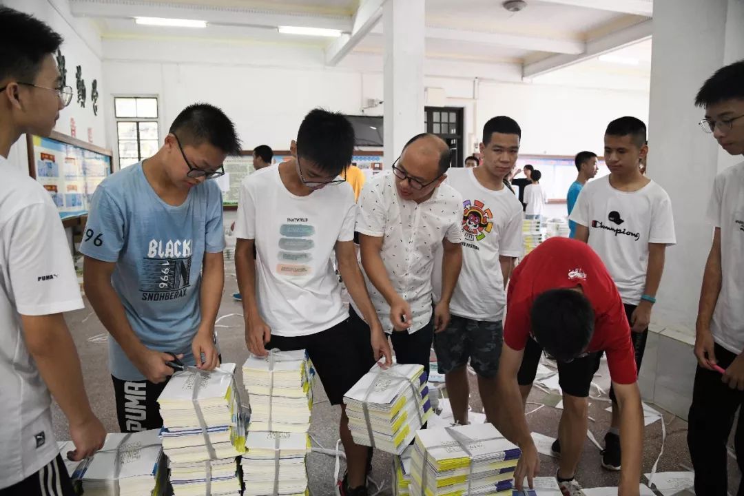 新学期开始了,语数英政史地生理化书本整整齐齐摆放在地上,高一级组长李贵兴正在组织学生代表领课本。