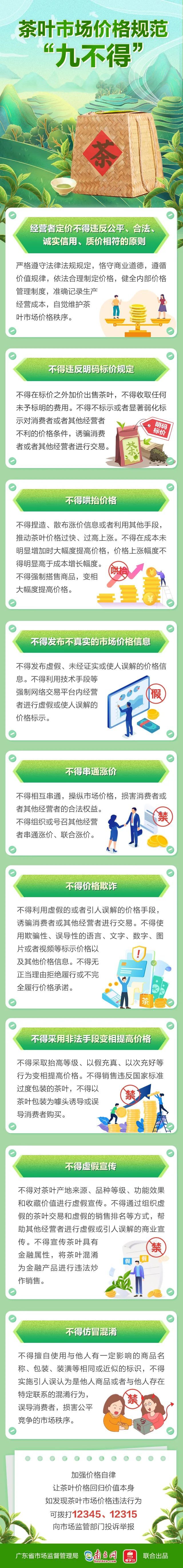 各茶叶相关经营者及行业协会要逐一对照上述“九不得”要求,深入开展自查自纠,加强价格自律,让茶叶价格回归价值本身。广大群众如发现茶叶市场价格违法行为,可以通过12345、12315平台热线向市场监管部门投诉举报。全省各级市场监管部门将加大执法力度,依法从严查处违法违规炒作销售茶叶行为,对情节恶劣的典型案件,将依法从重处罚并公开曝光,涉嫌犯罪的,依法移送司法机关。