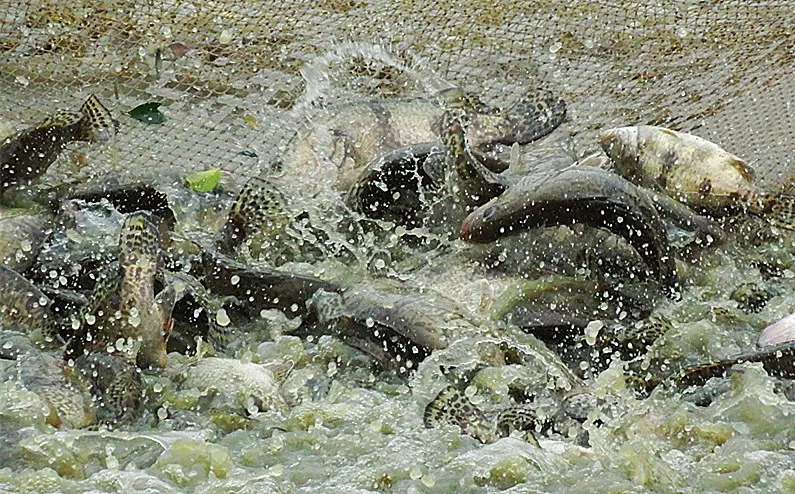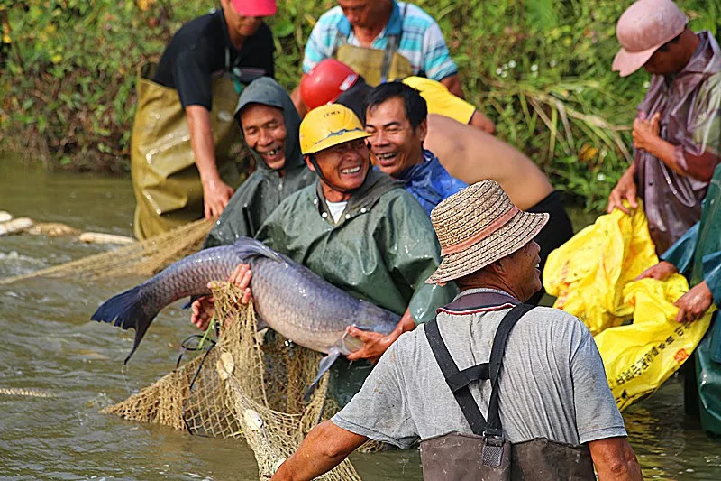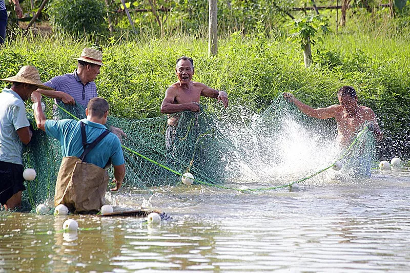 村民在鱼塘河涌里刮出一萝萝肥美的河鲜
