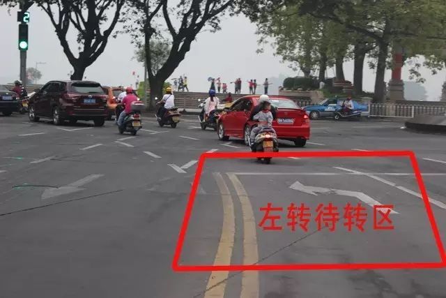 驾车在路口进入左转车道时,如果左转方向为红灯、直行方向为绿灯,若前方有左转待驶区,左转车辆应越过停车线依次进入待驶区。待左转方向信号灯变绿,即可左转行驶。如果左转方向是绿灯,则应直接驶过待驶区,禁止停留。