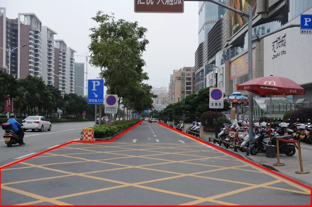 (汇悦大融城正门辅道黄色实线路段和网格区)