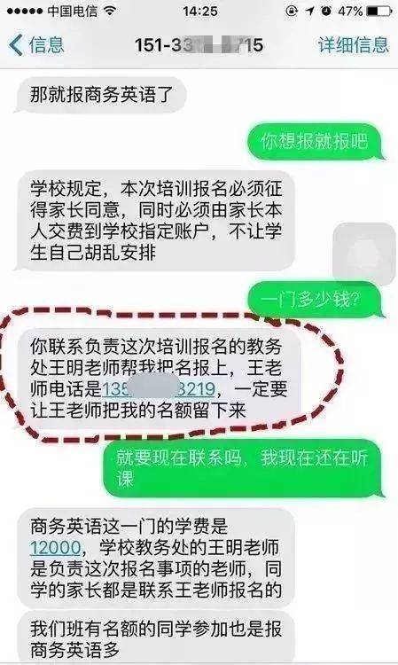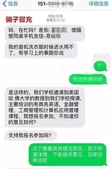 二是提前设定情境,避免家长核实。在发信息时,骗子一般会以学生的口吻,称“自己的手机摔坏、进水、没电无法接听电话”,“用的是同学手机”“正在上课”,来给家长制造一种情境,一方面消除家长在接到陌生号码发来信息时的疑虑,另一方面避免家长打电话核实,骗局败露。