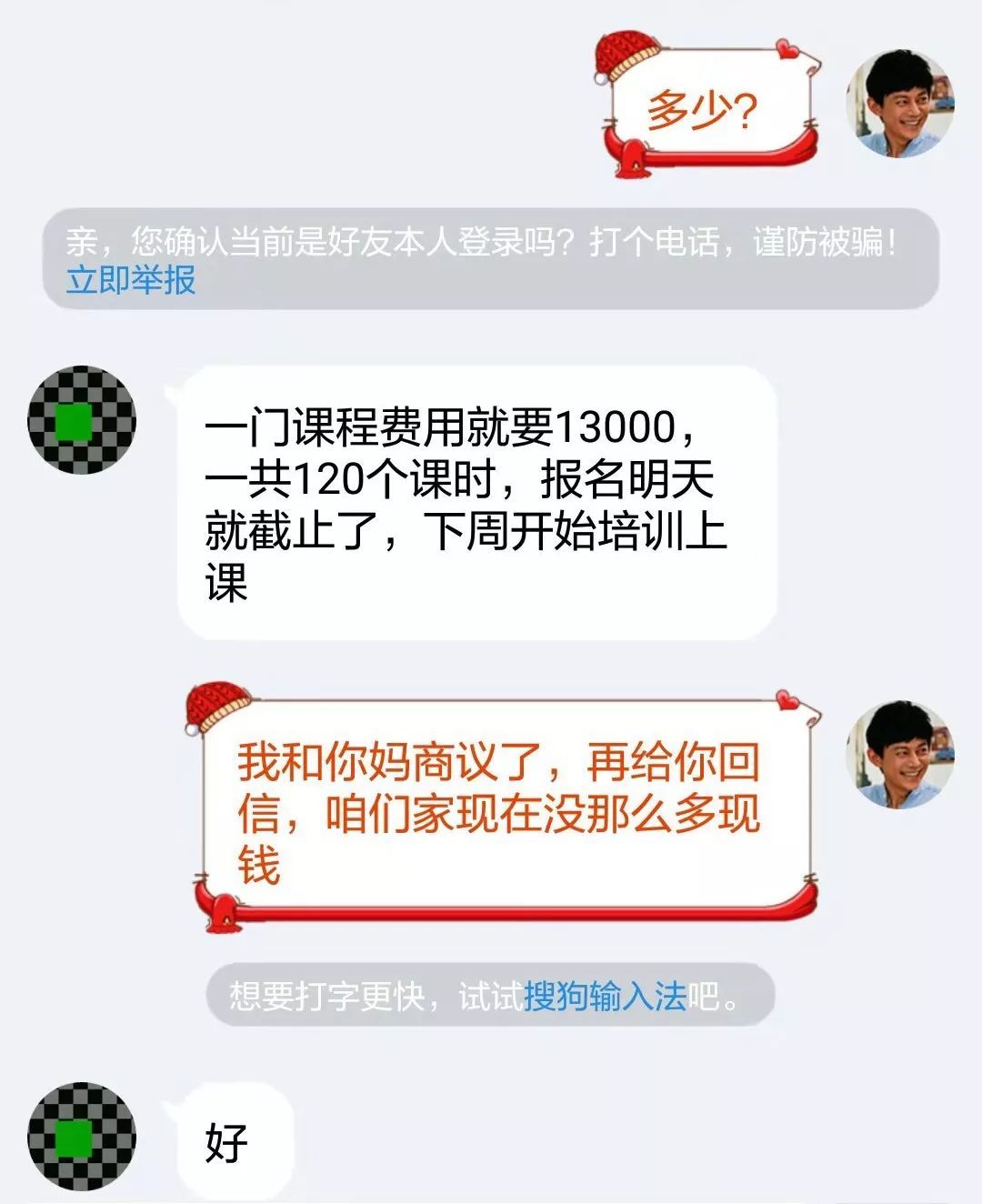 布丁播报近期,蓬江发生了多起通过虚构培训班,缴纳培训费的诈骗案件。在近一个月里,这类案情就多达10余宗,涉案总金额达10万余元!诈骗人员通过盗取、冒充在校学生QQ、微信等联系父母,以学校、教育局、名校教授等提供难得的名校培训机会名义吸引家长,同时让家长联系所谓的教务处主任、老师,在对方要求下转账汇款被骗。由于近期该类诈骗案件频发,蓬江公安发布预警,请各位家长务必提高对此类诈骗信息的警惕性。这究竟是怎么回事呢?马上跟着布丁君来看看➲