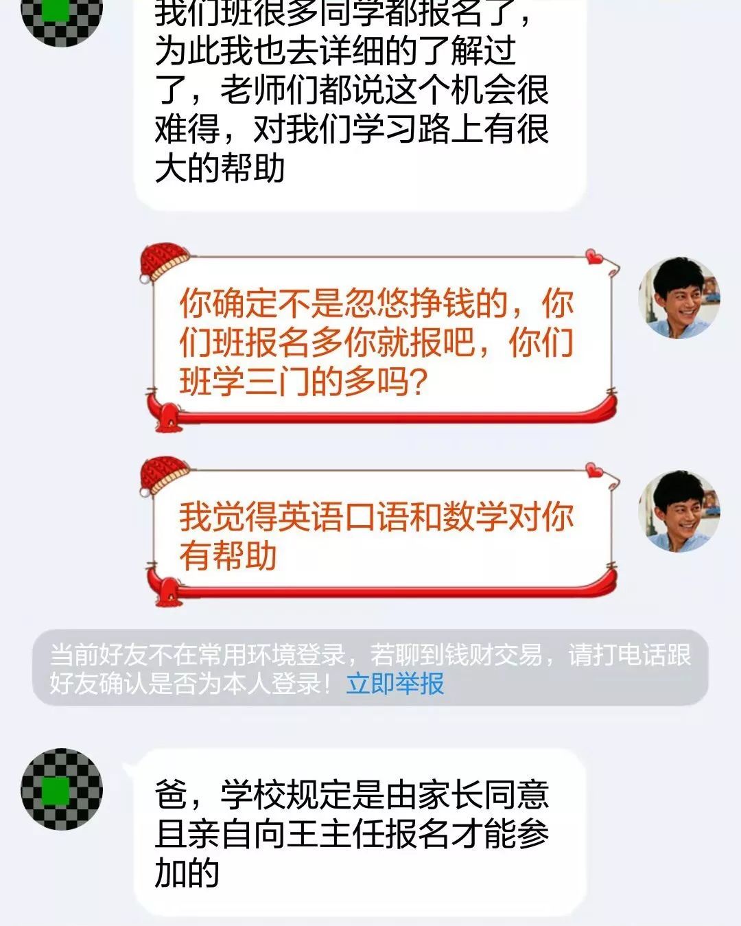 三是制造紧张气氛,成功实施诈骗。如果家长犹豫不决,骗子一般会以“名额马上没有”、“不报名对自己影响很大”为由,制造紧张气氛,利用家长“望子成龙,望女成凤”、“爱子心切”的心理,要求马上转账或者汇款,实施诈骗。
