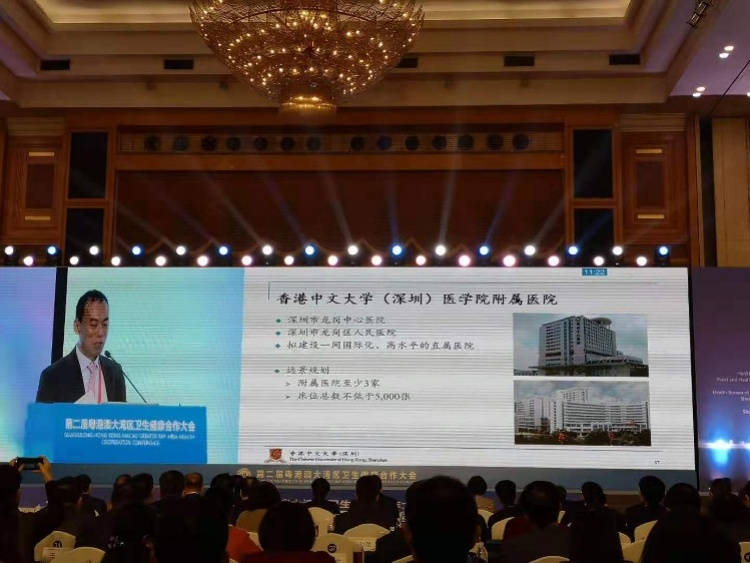 香港中文大学(深圳)校长徐扬生在会上做《开拓创新、充分利用两地资源,加快发展粤港澳大湾区医疗事业》报告。香港中文大学(深圳)将开设医学院,同时在龙岗建设一家国际化、高水平的直属医院,未来打算建设至少3家附属医院,床位总数不低于5000张。