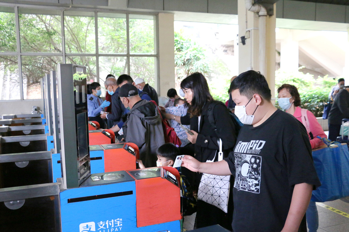 4月4日上午11点01分,香港西九龙开往广州东方向的G6554次列车准点停靠常平站。下车的旅客手持回乡证,携带大包小包有序排队出站。常平站工作人员及志愿者现场为有需要的旅客提供指引,帮助他们快速出站。